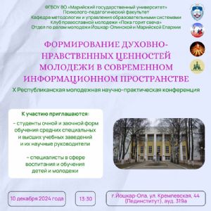 10 декабря 2024 года в рамках Региональных Рождественских образовательных чтений и реализации Соглашения о сотрудничестве между Марийским государственным университетом и Йошкар-Олинской епархией состоится Х Республиканская молодежная научно-практическая конференция «Формирование духовно-нравственных ценностей молодежи в современном информационном пространстве».