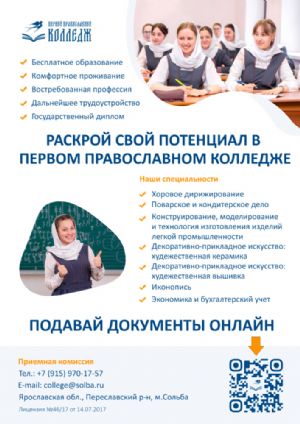 Первый православный колледж в России при Николо-Сольбинском женском монастыре в Ярославской области приглашает абитуриентов девушек на базе 9 и 11 классов получить фундаментальное профессиональное образование и духовно-нравственное воспитание в лучших исконно русских православных традициях.