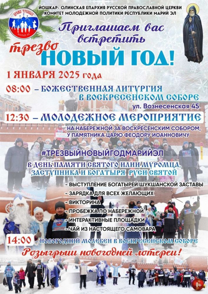 В 12:30 на набережной реки Кокшаги, за Воскресенским собором у памятника царю Феодору Иоанновичу пройдет молодежное мероприятие, посвященное дню памяти святого преподобного Илии Муромца. В программе: забег по набережной, конкурсы, викторины, интерактивные площадки и др.