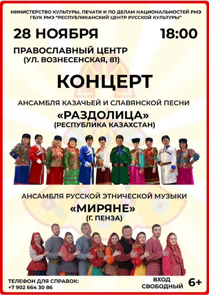 28 ноября в 18:00 в Православном центре г. Йошкар-Олы по благословению митрополита Йошкар-Олинского и Марийского Иоанна в рамках Международного фестиваля-конкурса русской и славянских культур «Корнями в России» пройдёт концерт ансамбля русской этнической музыки «Миряне» (г. Пенза) и ансамбля казачьей и славянской песни «Раздолица» (г. Костанай).