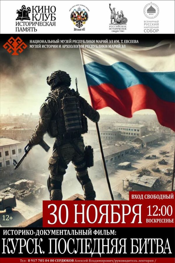 30 ноября (воскресенье) в 12:00 в Музее истории и археологии (Йошкар-Ола, ул. Эшкинина, дом 10-а, вход со стороны набережной) состоится показ историко-документального фильма «Перед судом истории. Курск. Последняя битва».