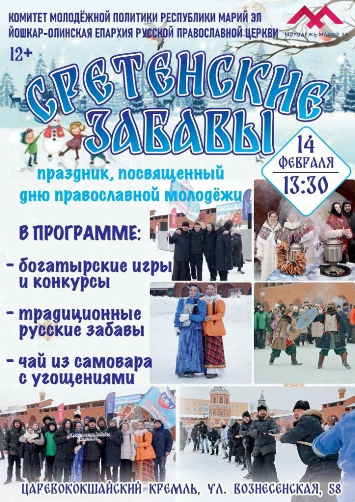 14 февраля в Йошкар-Оле, в Царевококшайском кремле пройдут традиционные «Сретенские забавы», приуроченные ко Дню православной молодежи. Начало в 13:30.