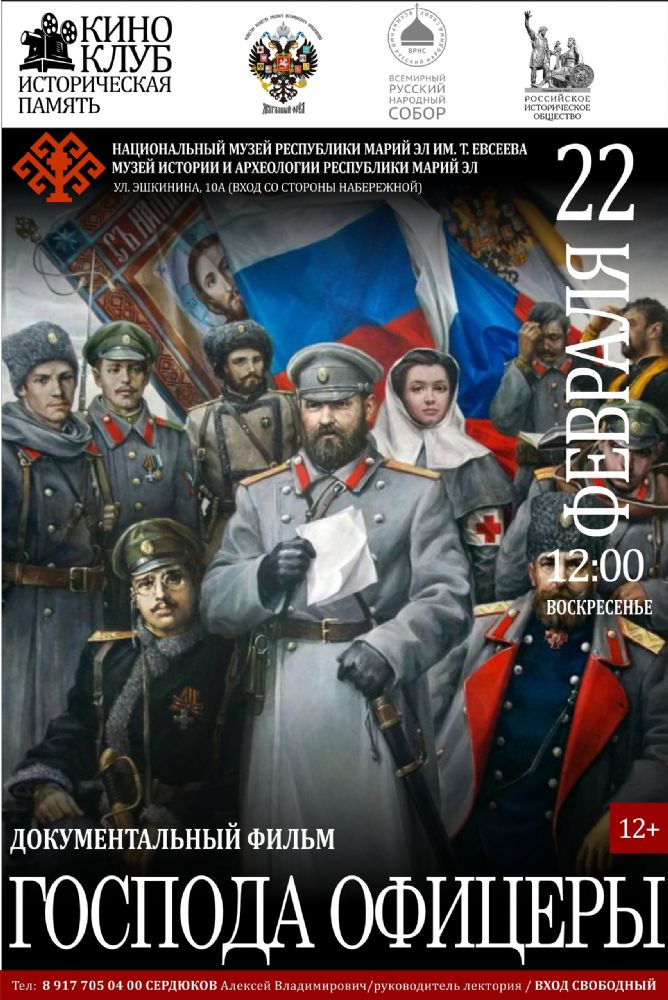 22 февраля (воскресенье) в 12:00 в Музее истории и археологии (Йошкар-Ола, ул. Эшкинина, дом 10-а, вход со стороны набережной) состоится показ документального фильма «Господа офицеры».