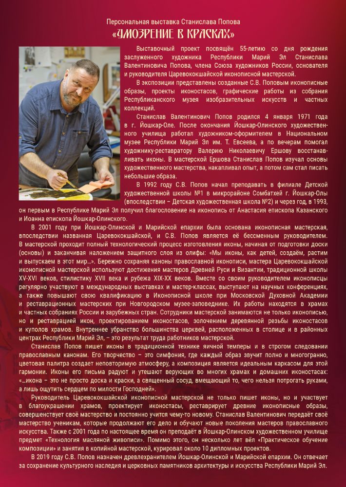 16 апреля Национальной художественной галерее открывается персональная выставка «Умозрение в красках». Выставочный проект посвящён 55-летию со дня рождения заслуженного художника Республики Марий Эл Станислава Валентиновича Попова, члена Союза художников России, основателя и руководителя Царевококшайской иконописной мастерской.