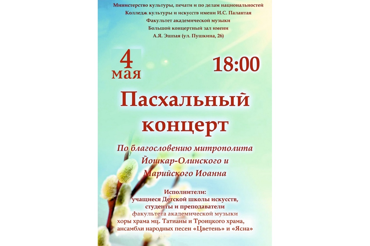 4 мая в Колледже культуры и искусств им. И.С. Палантая по благословению митрополита Йошкар-Олинского и Марийского Иоанна состоится Пасхальный концерт.