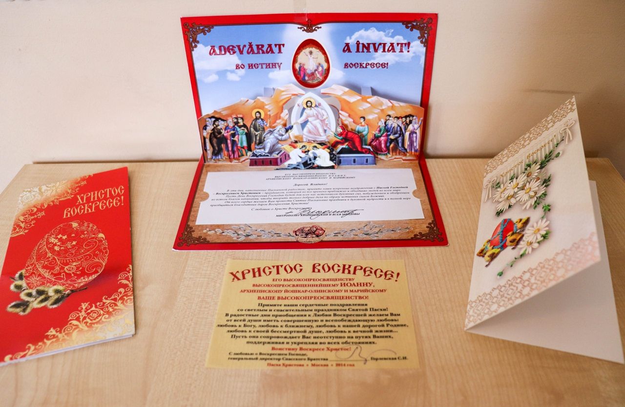 Выставка составлена из современных пасхальных открыток, хранящихся в личном архиве митрополита Йошкар-Олинского и Марийского Иоанна.