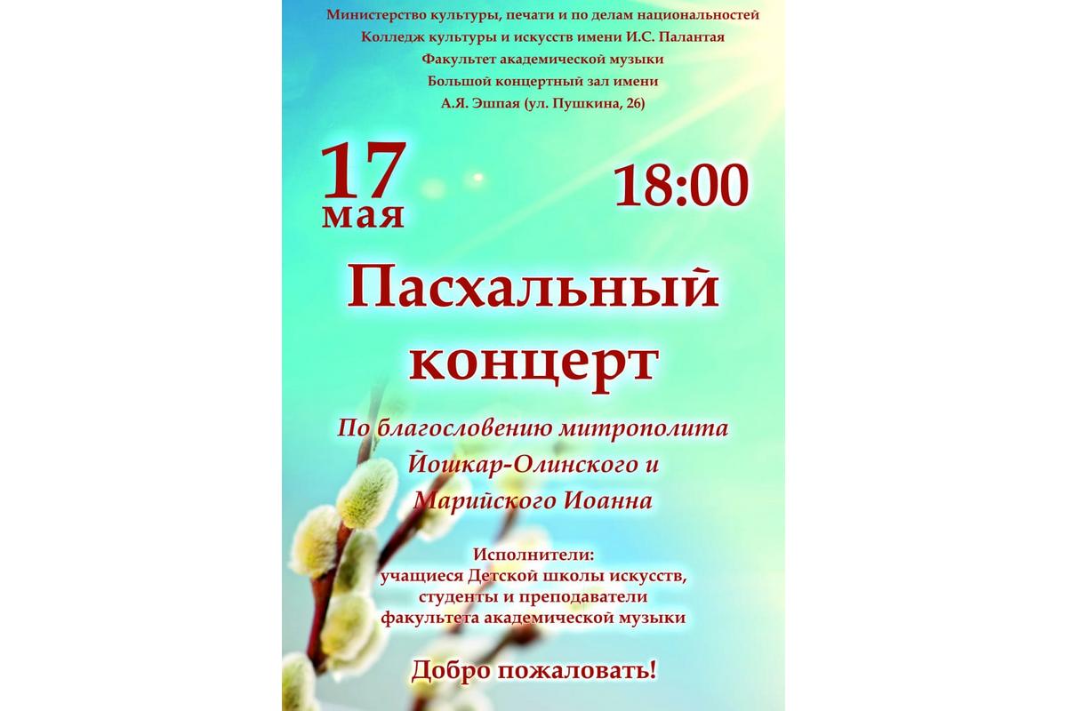 17 мая в Колледже культуры и искусств им. И.С. Палантая по благословению митрополита Йошкар-Олинского и Марийского Иоанна состоится Пасхальный концерт.