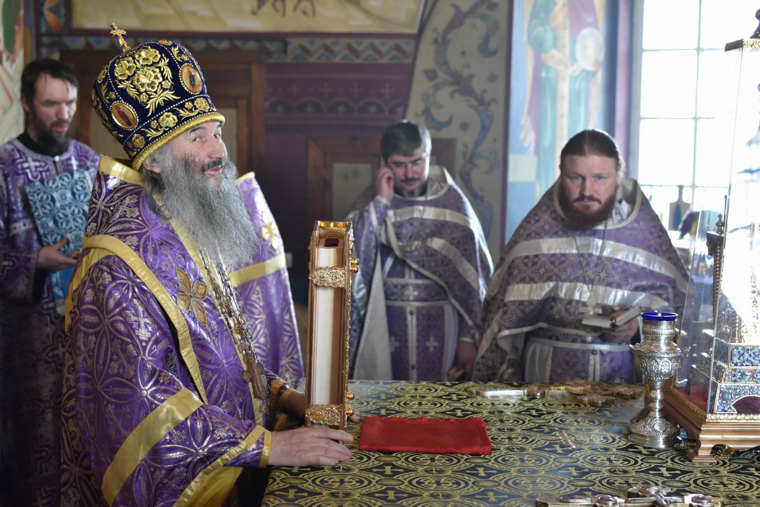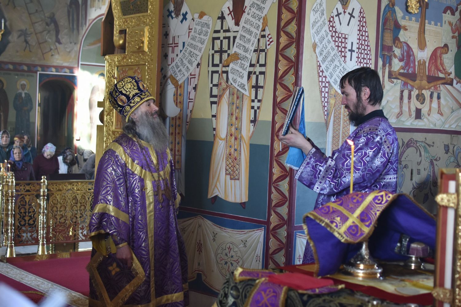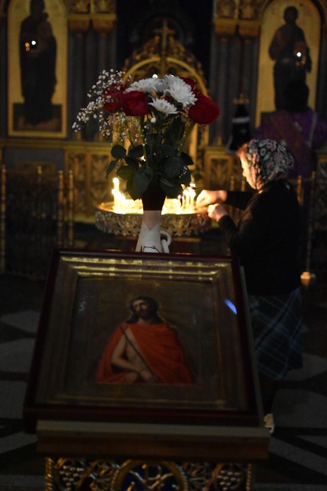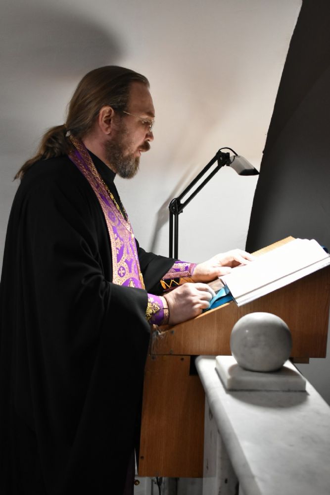 После чтения трех кафизм на утрене в алтаре Владыка прочитал Евангельский отрывок из Евангелия от Иоанна (12 глава) о страданиях, будущей славе и вере в Господа Иисуса Христа.