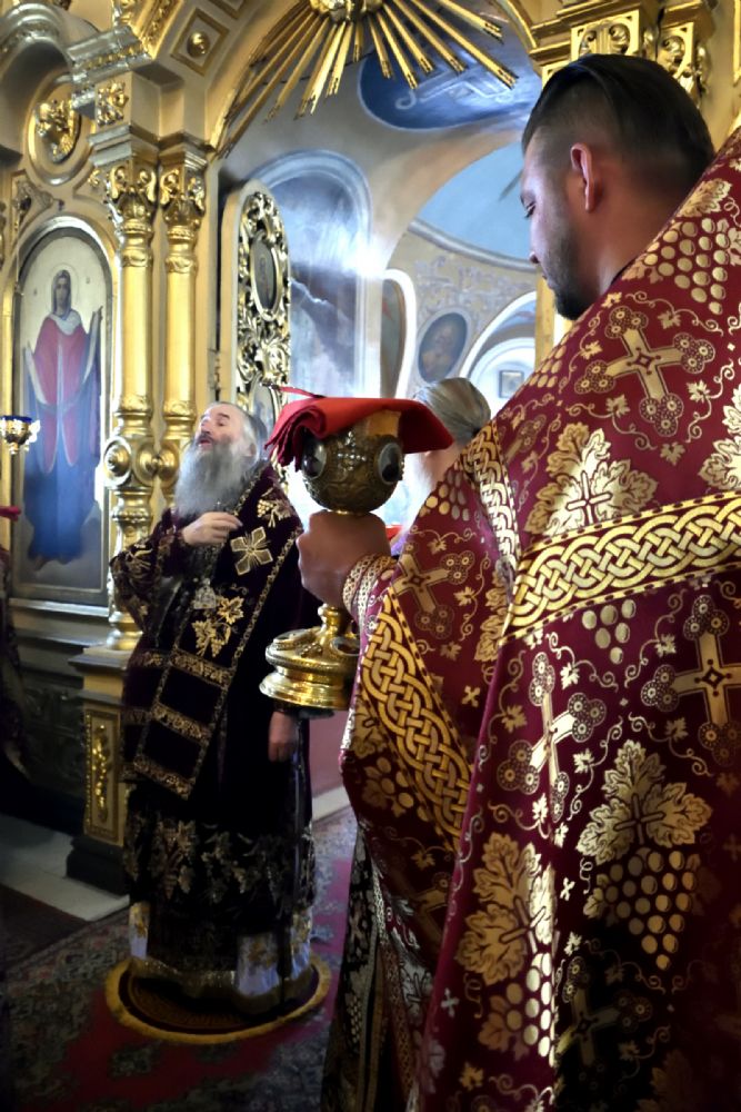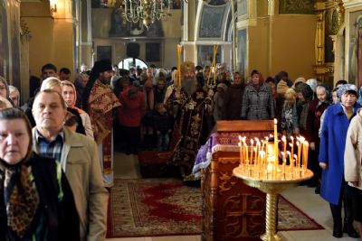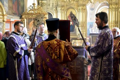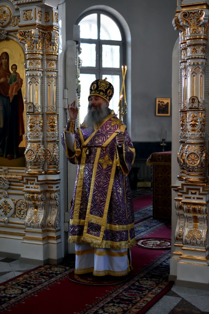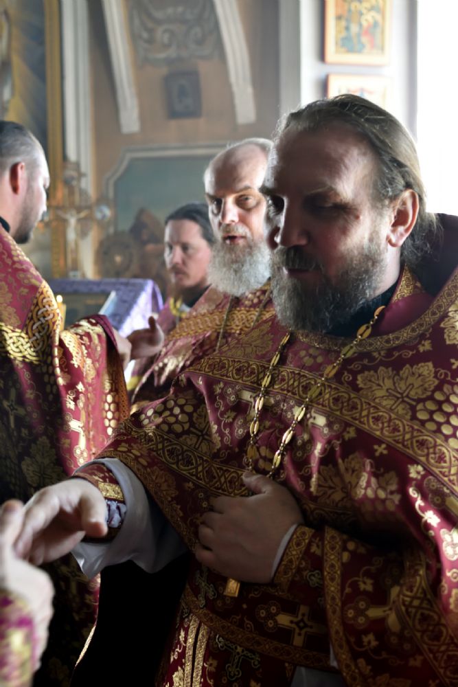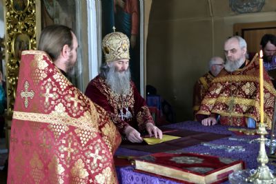 Владыке сослужили секретарь Йошкар-Олинского епархиального управления иеромонах Серафим (Пасанаев), клирик собора иерей Леонид Вылекжанин, клирик храма Рождества Пресвятой Богородицы с. Семеновка протодиакон Михаил Козловский и клирик собора диакон Алексей Кузнецов.