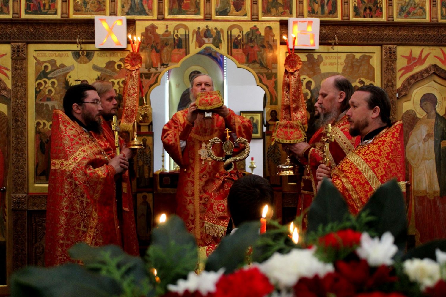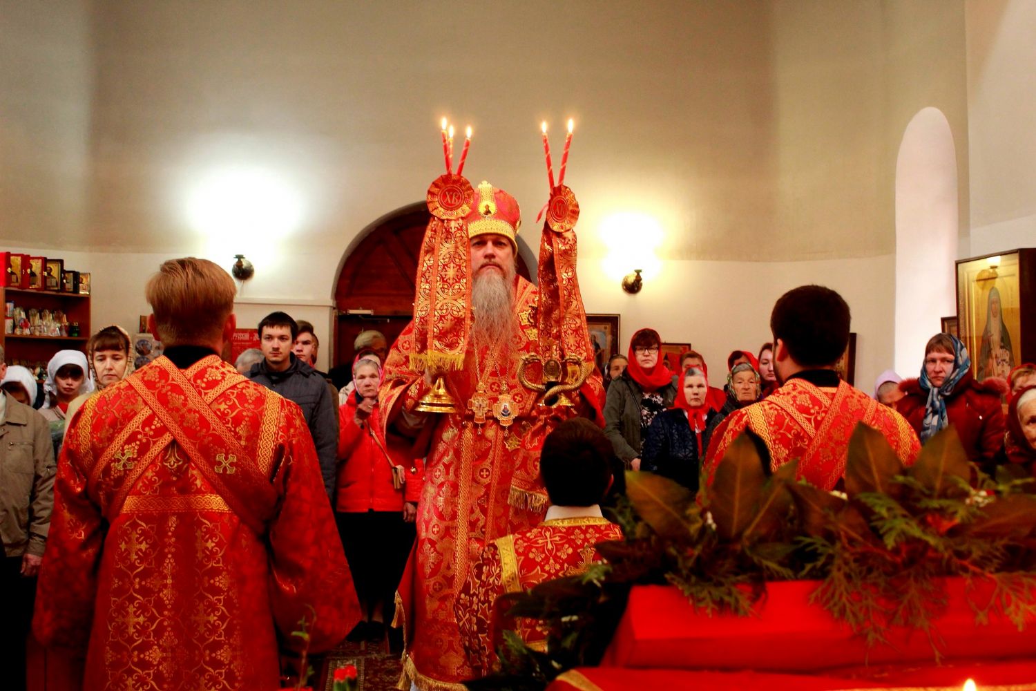 Его Преосвященству сослужили: секретарь Волжской епархии, настоятель храма протоиерей Александр Михайлов, настоятель храма преподобномученика Андрея Критского с. Елембаево протоиерей Сергий Бажанов, клирик храма святого праведного Иоанна Кронштадтского г. Волжска иерей Матфей Сапаев, клирик Никольского кафедрального собора г. Волжска диакон Иоанн Захаров.