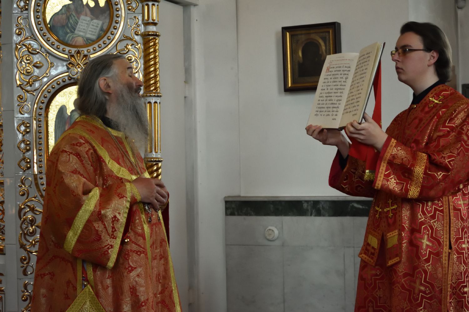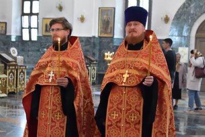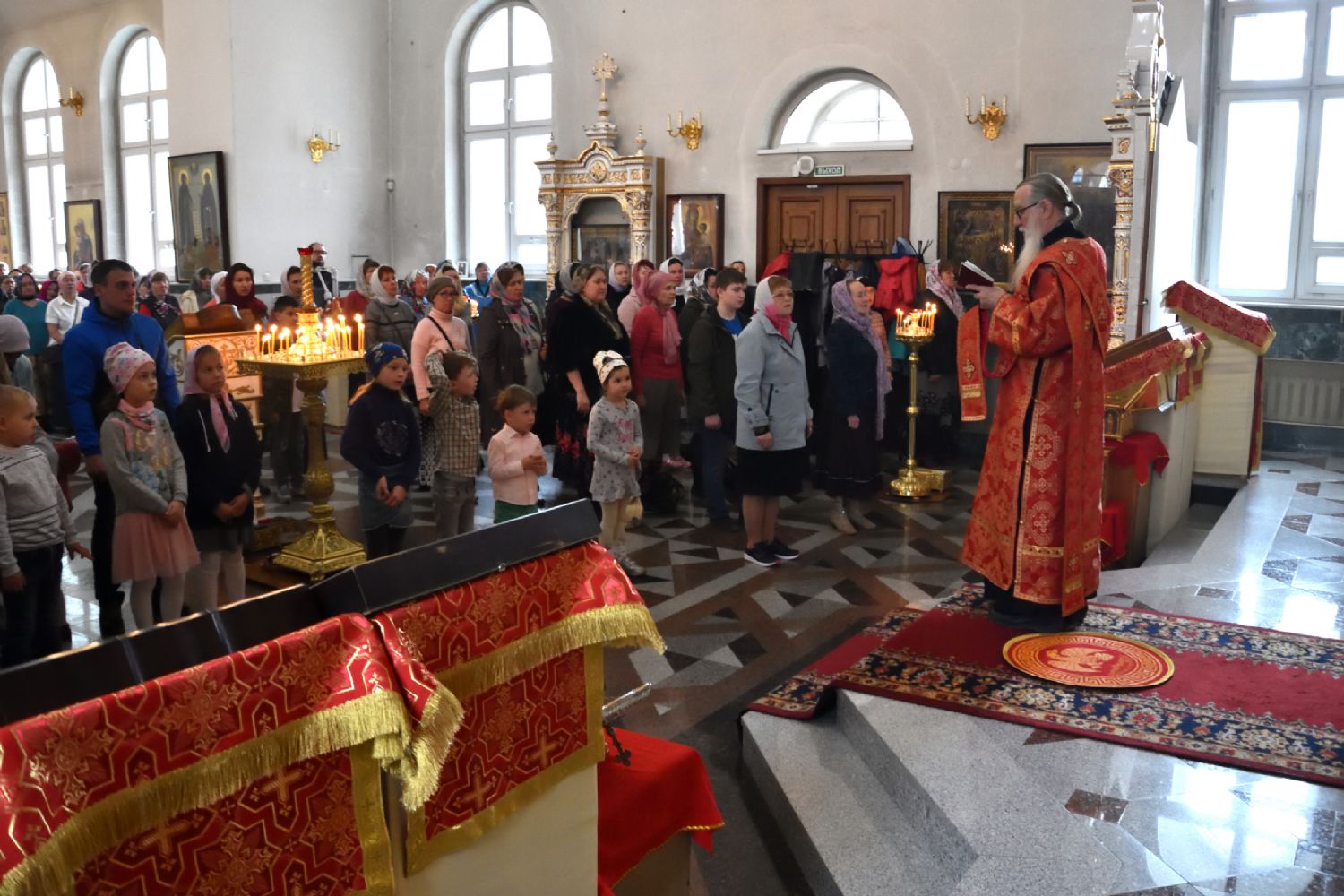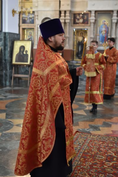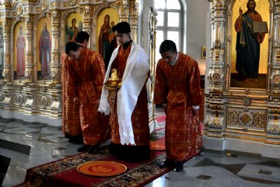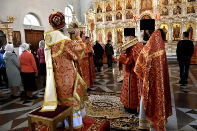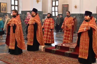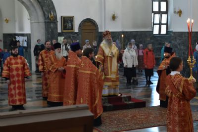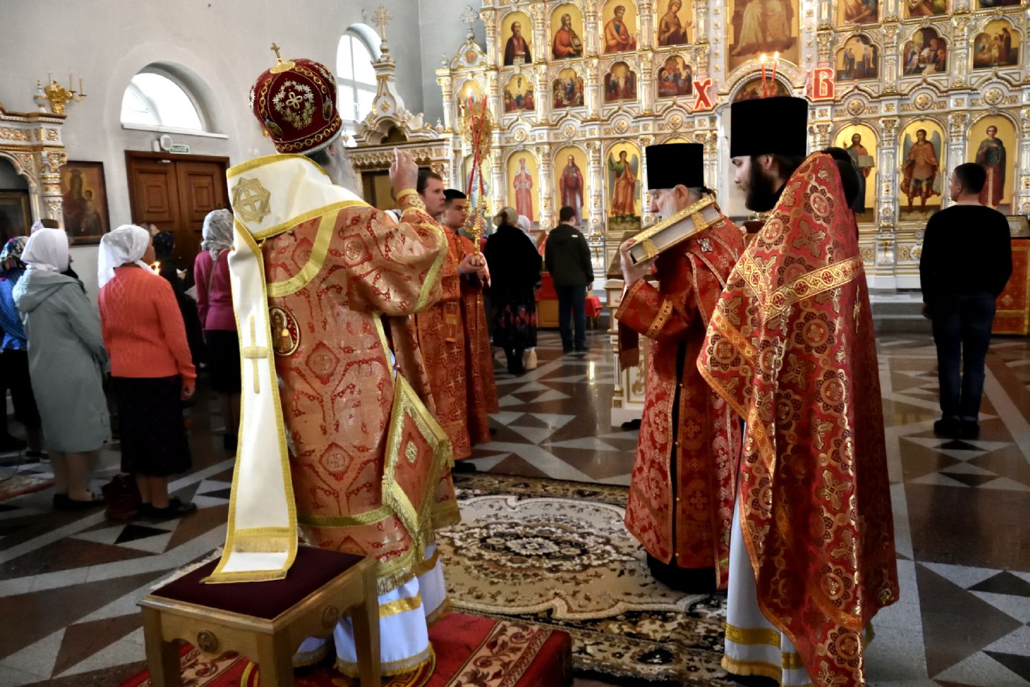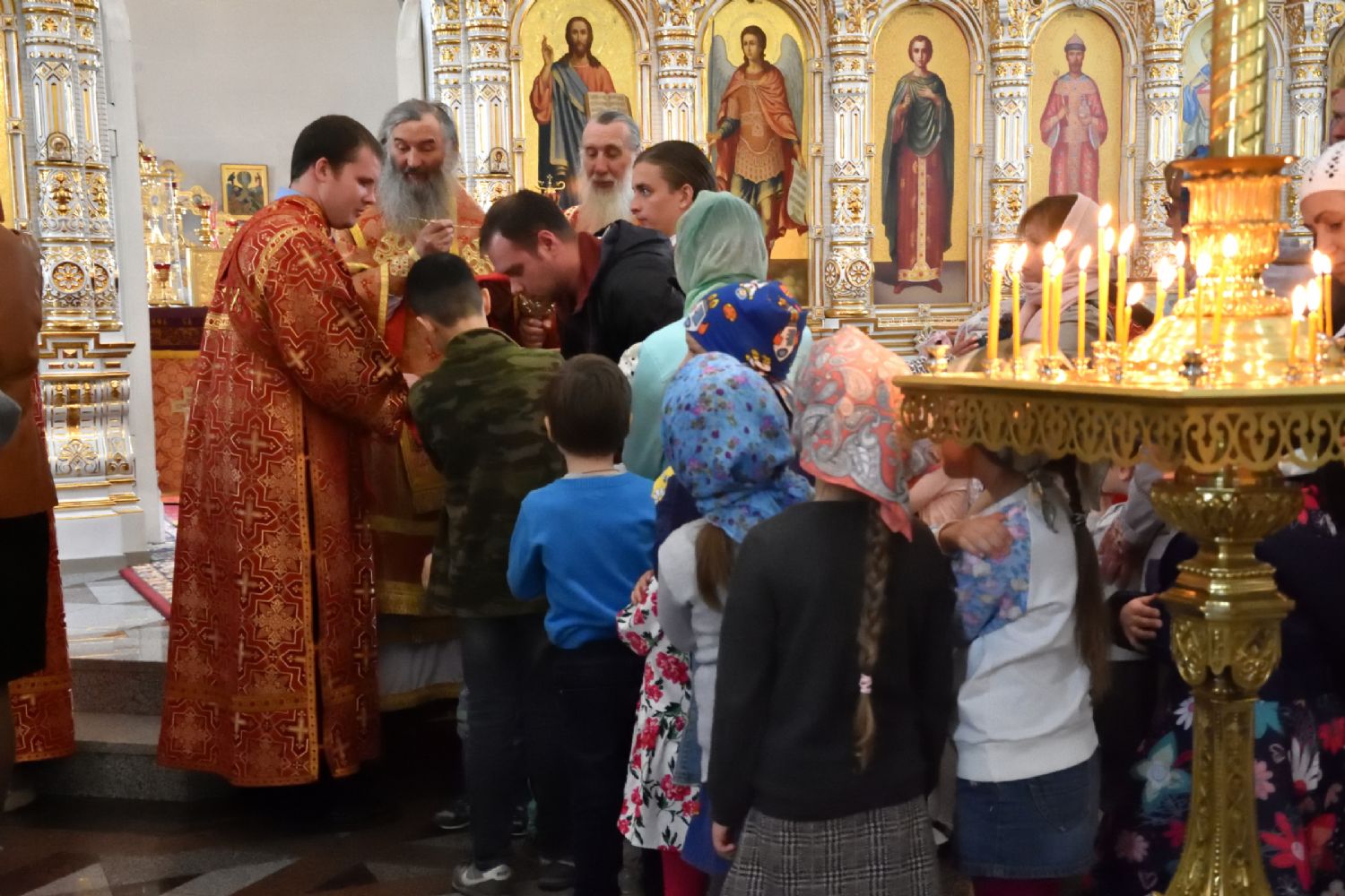 Владыке сослужили: ключарь собора протоиерей Сергий Поглазов, клирики собора иереи Никифор Захаров, Евгений Самойлов, диаконы Андрей Дружинин, Игорь Коваль и клирик храма Рождества Пресвятой Богородицы с. Семеновка протодиакон Михаил Козловский. Песнопения исполняли младшая и старшая группы хора "Благовест".