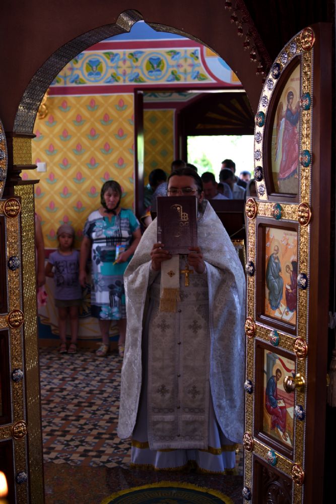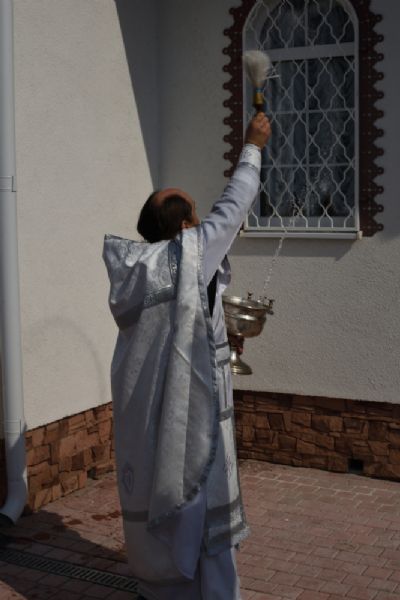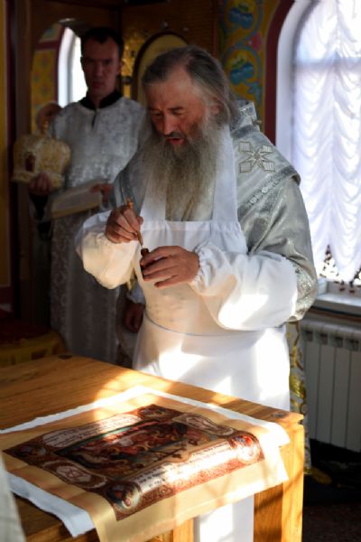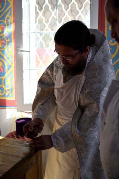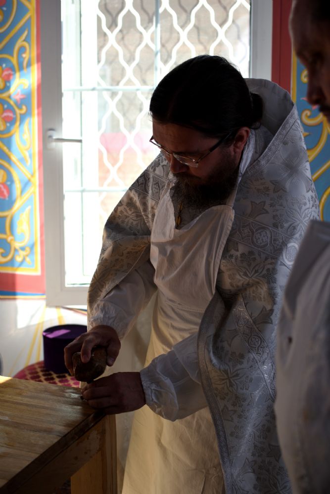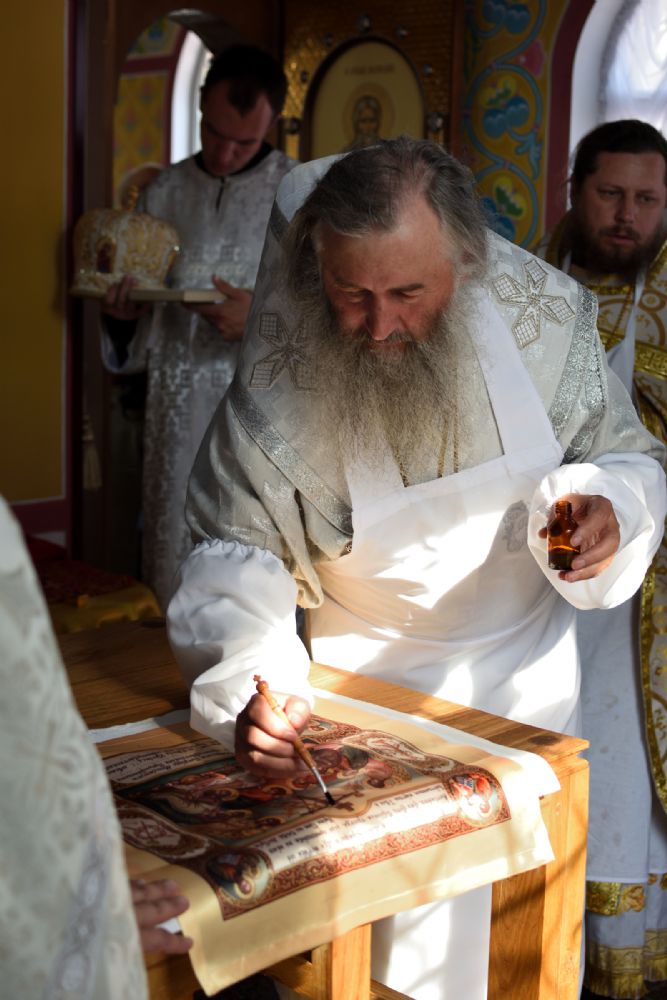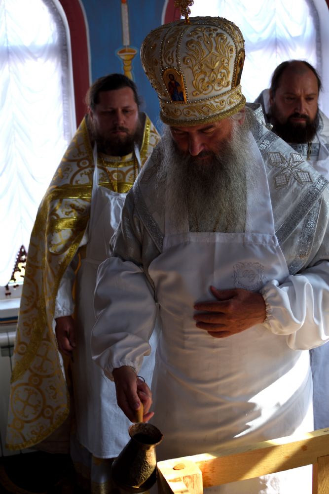 В ходе чина митрополит с сослужащим священством освятил престол храма и жертвенник, обошел с кроплением и каждением храм внутри и снаружи. Затем после чтения 3-го и 6-го часов была отслужена Божественная литургия святителя Иоанна Златоуста.