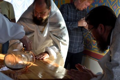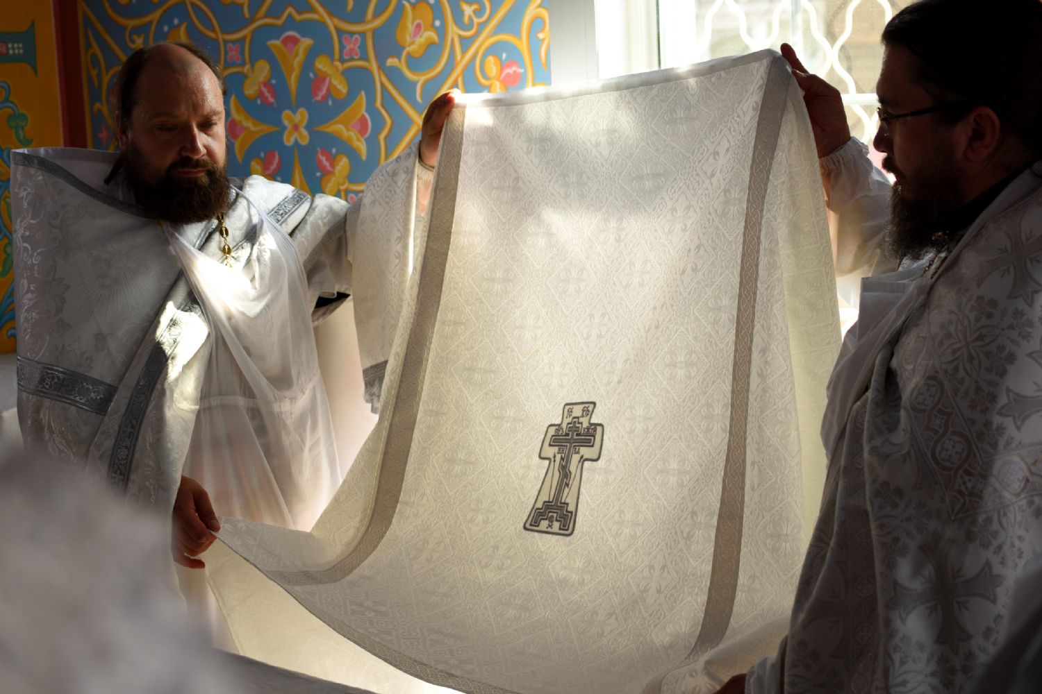 Богослужение началось торжественной встречей митрополита Иоанна, несущего частицы мощей священномученика Владимира Киевского и Вифлеемских младенцев для закладки под престол и в антиминс.