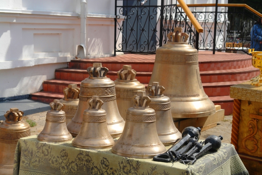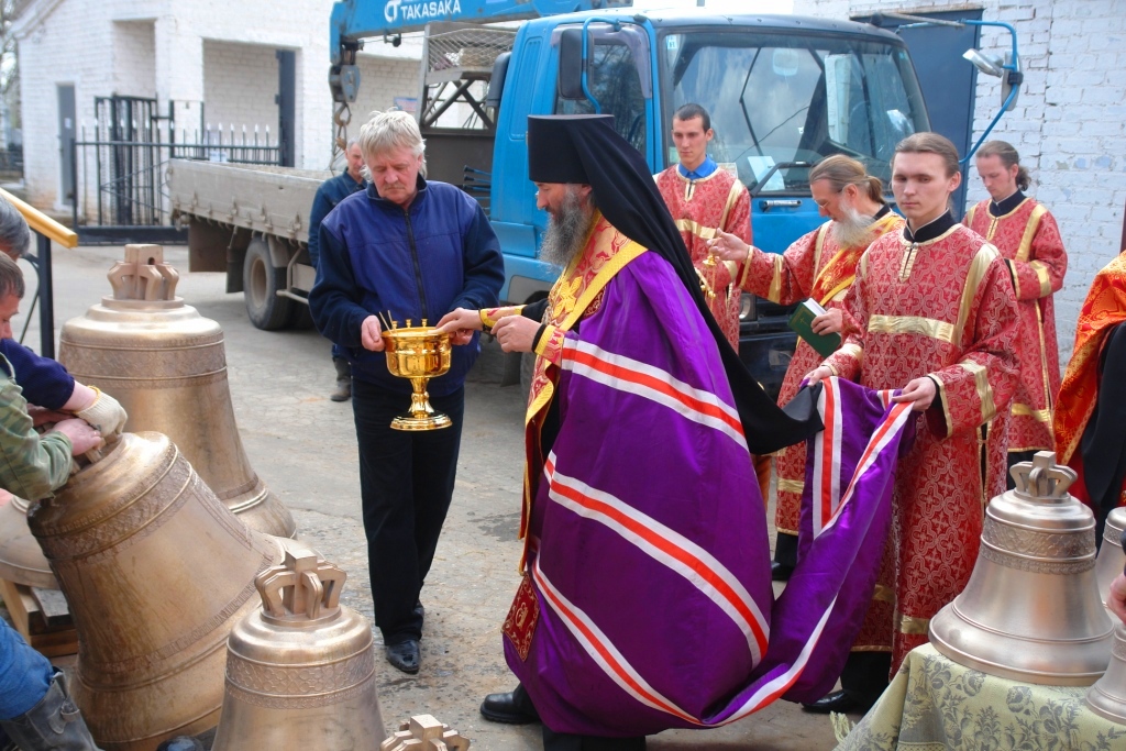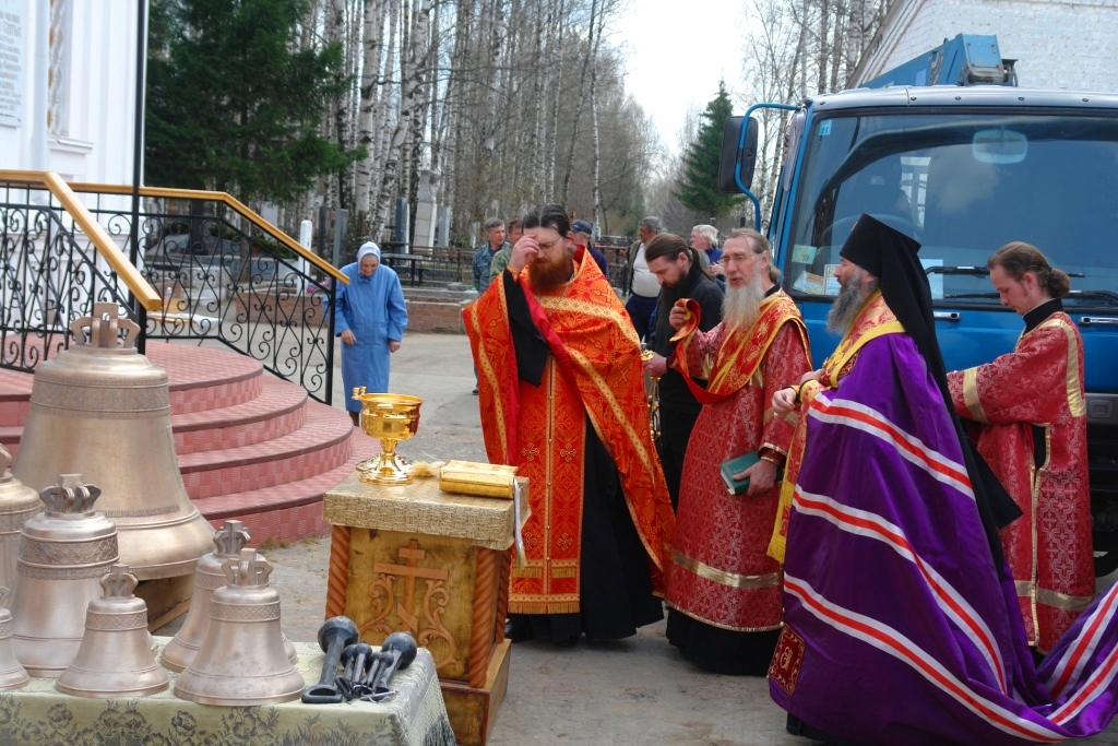 Вчера здесь состоялся чин освящения новых колоколов. Совершил его архиепископ Йошкар-Олинский и Марийский Иоанн. По традиции первые удары большого колокола произвел сам Владыка.