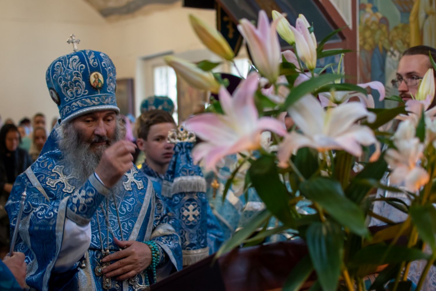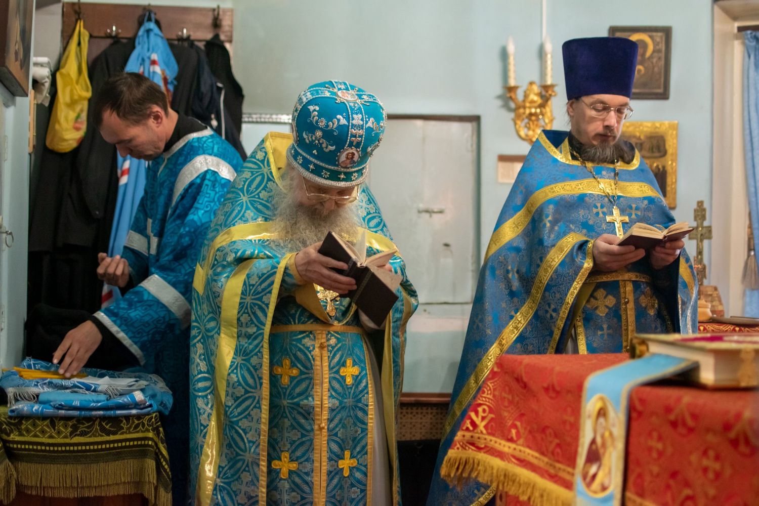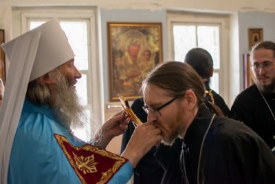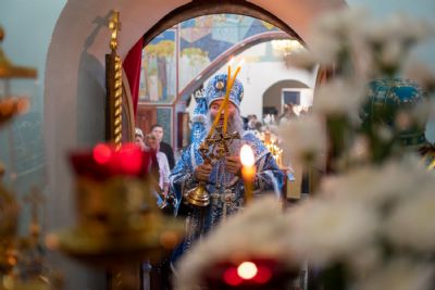 До Литургии был совершен чин малого освящения воды и прочитаны 3-й и 6-й часы. После встречи митрополита Иоанна и облачения началась Божественная литургия Иоанна Златоуста архиерейским чином.