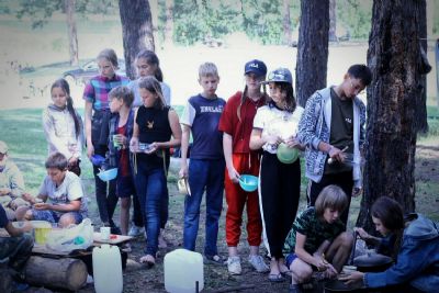 По прибытии на озеро туристы дружно разбили лагерь, мальчики развели костер, и все вместе приготовили походный костровой обед.
