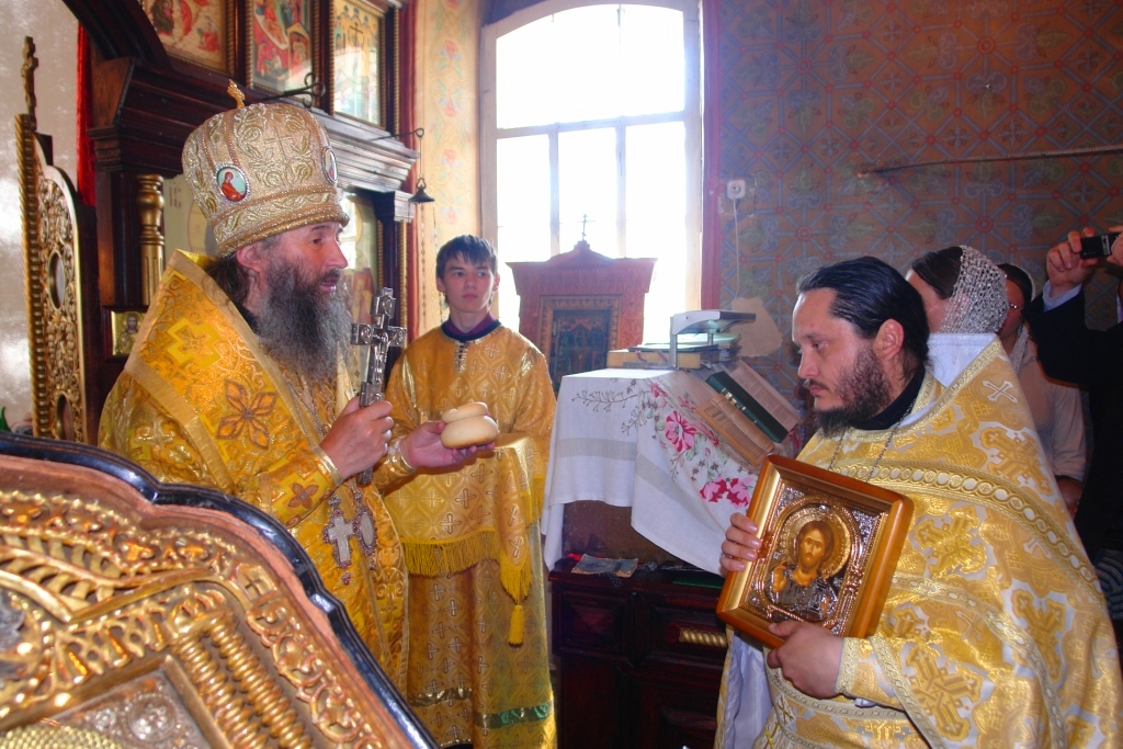 В своей проповеди Владыка поздравил отца Алексия и вручил ему икону Спасителя и Богородичную просфору, напутствовав словами: «Пусть Спаситель мира хранит тебя от дьявольских искушений, дает тебе силу и крепость побеждать врага, воюющего на нас, даст тебе мудрость и ревность по Бозе в окормлении своей паствы».