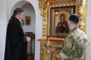 В заключении отец Александр провел духовную беседу о понятиях греха и добродетели, духовном совершенствовании, нравственных и мировоззренческих представлениях религиозного человека, напомнил о десяти заповедях Библии, приводя примеры из жизни, и обратился к сотрудникам Росгвардии с пожеланием чаще видеть их в стенах храма. После духовной беседы священнослужитель окропил Росгвардейцев святой водой, благословил на ратную службу, пожелав помощи Божией в служении на благо Отечества, и каждому сотруднику и военнослужащему Росгвардии вручил на память иконку святого равноапостольного великого князя Владимира.