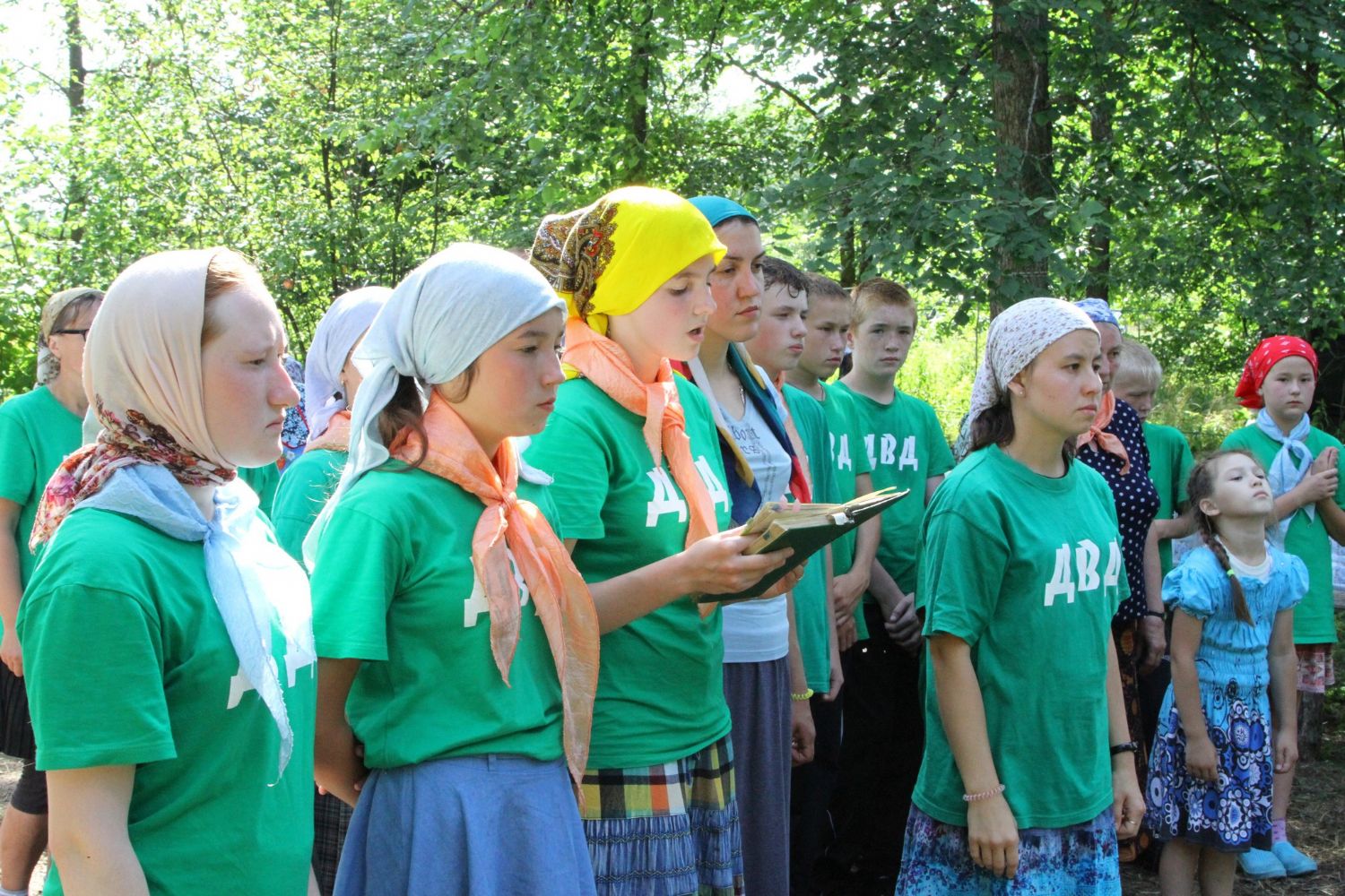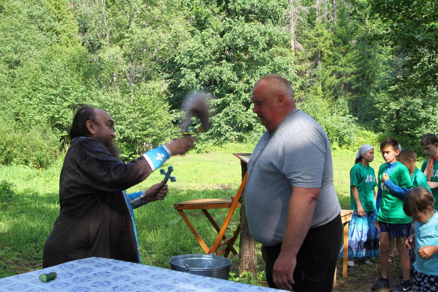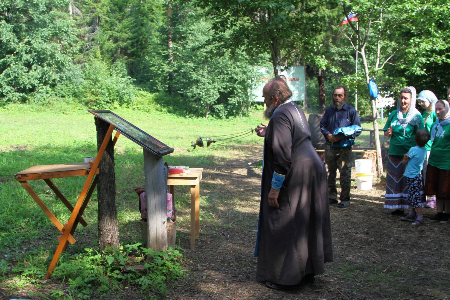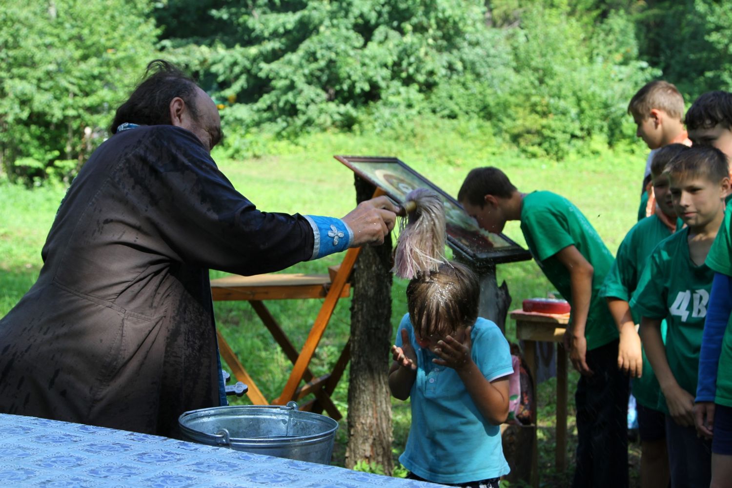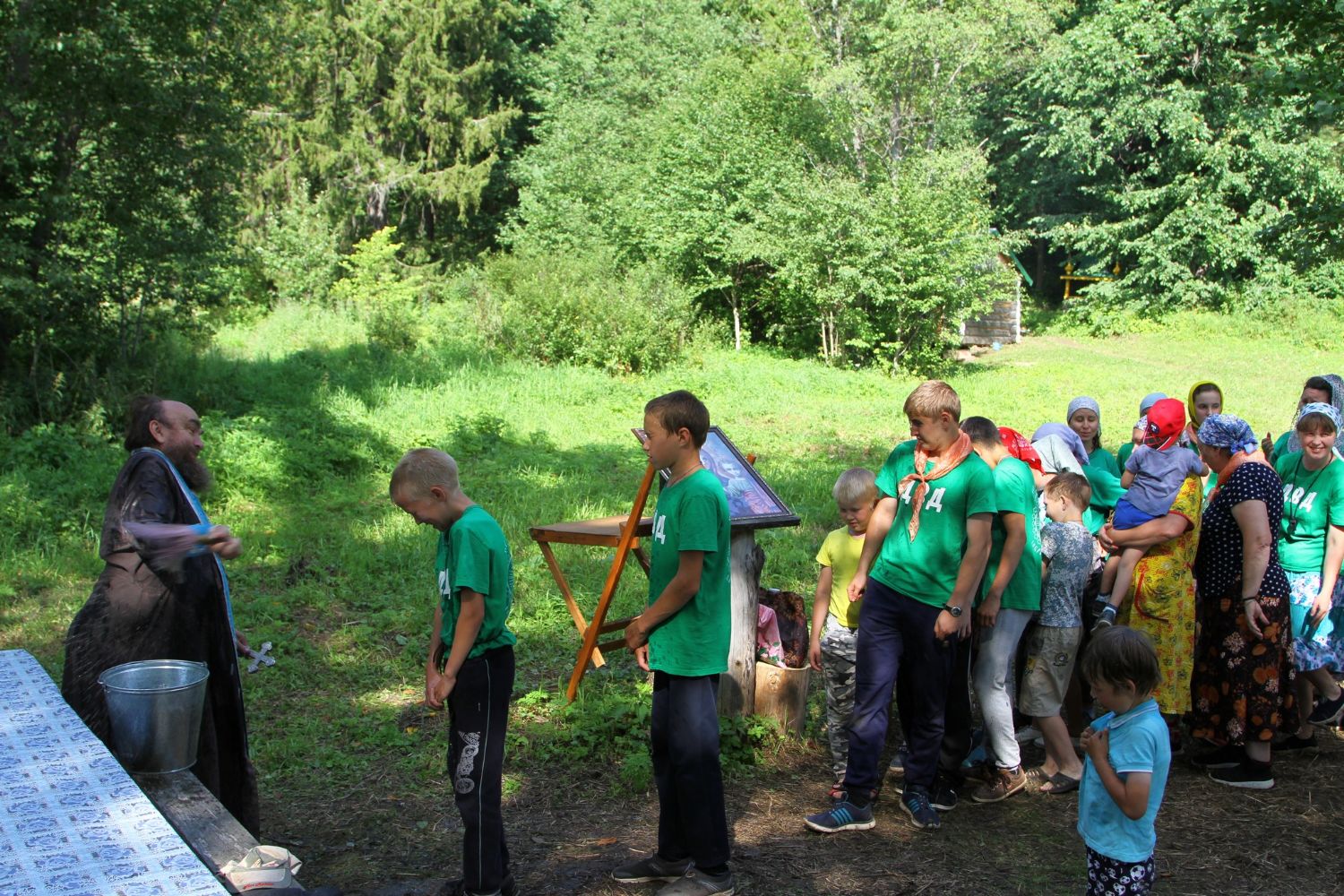 И, конечно же, самое главное, что помогает детям и объединяет их — это молитва. С молебна Пресвятой Богородице начался первый лагерный день. И, похоже, Матерь Божия вняла искренней детской молитве. По заезду в лагерь на небе - темные тучи, кажется, дождя не миновать. Такой печальный опыт уже был, когда из-за дождя пришлось свернуть лагерь и вернуться домой.