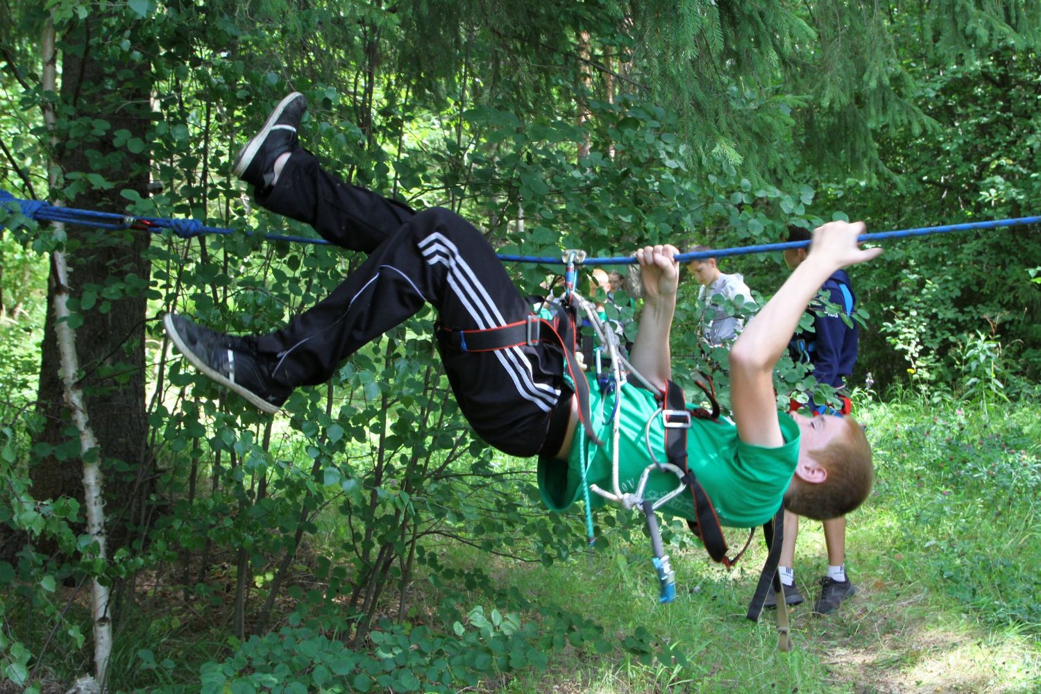 Еще одно запоминающееся событие в жизни лагеря – это занятие с альпинистами. Ребята одевают альпинистское снаряжение и перебираются через глубокий ров.