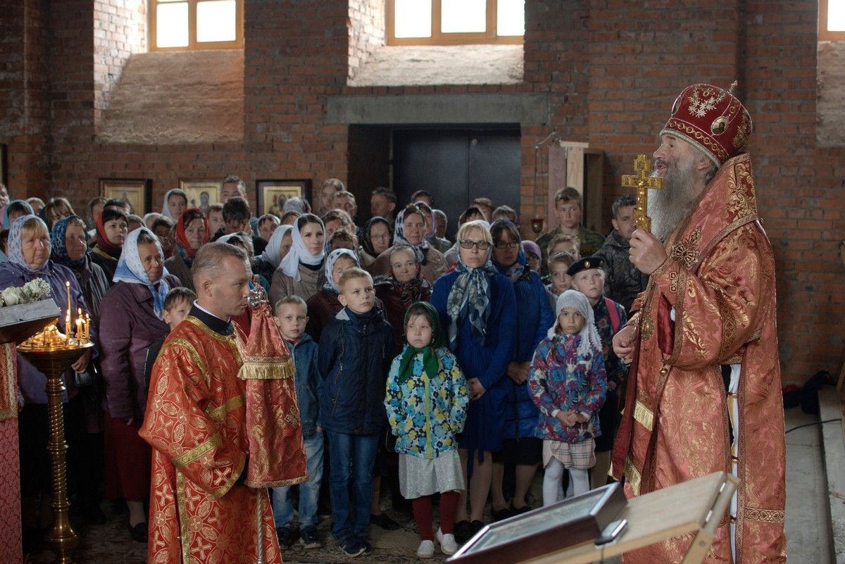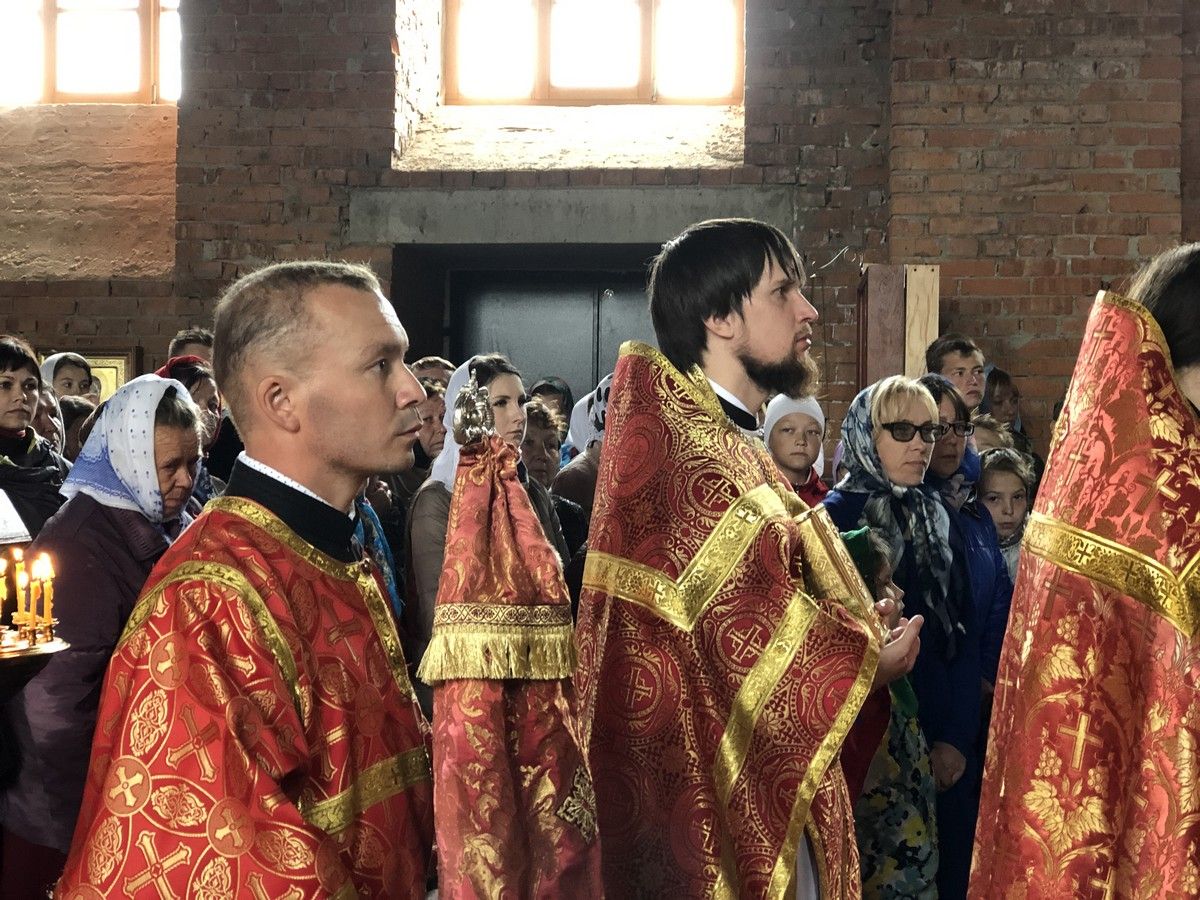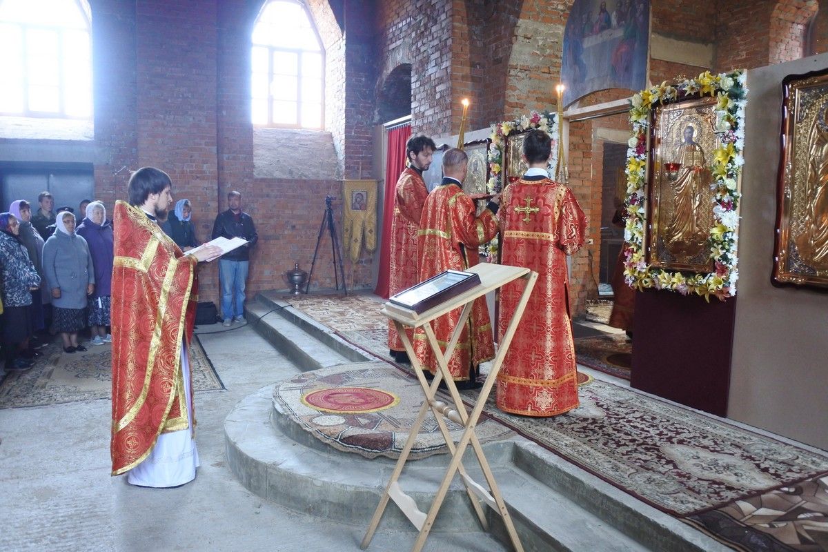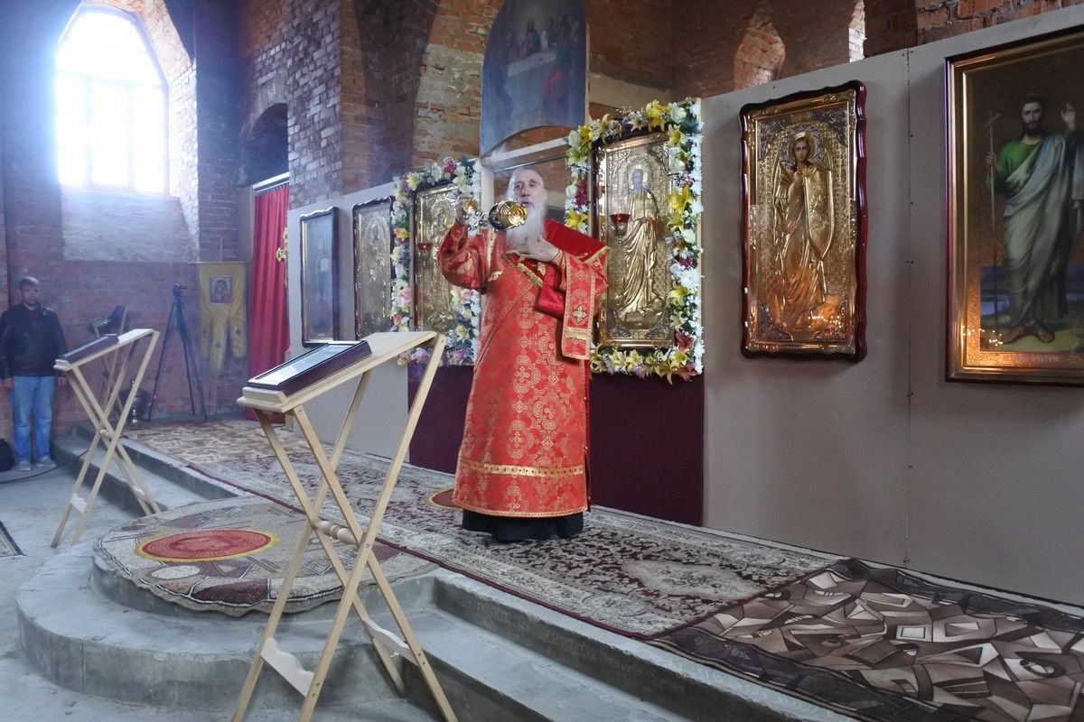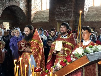 Сегодня у храма уже почти завершённый вид. Вот и первая Литургия! В ближайшие месяцы планируется оборудовать котельную и провести в храм тепло. Ведь теперь все богослужения планируется свершаться здесь. А уже в сентябре храм должны украсить купола, которые сейчас изготавливаются в г. Ростове-на-Дону.