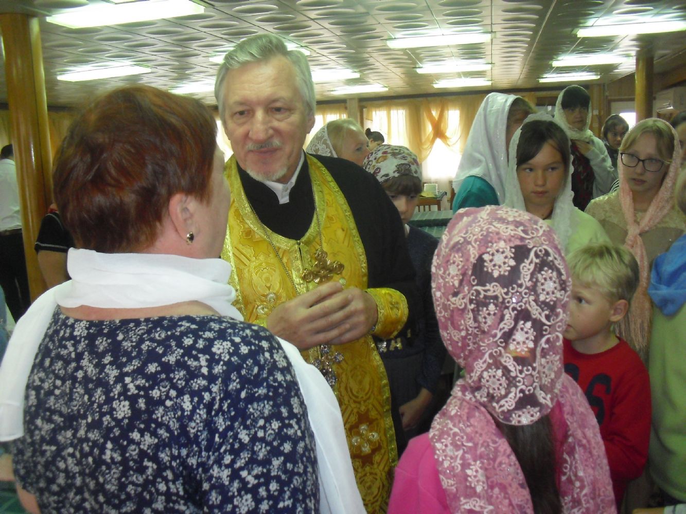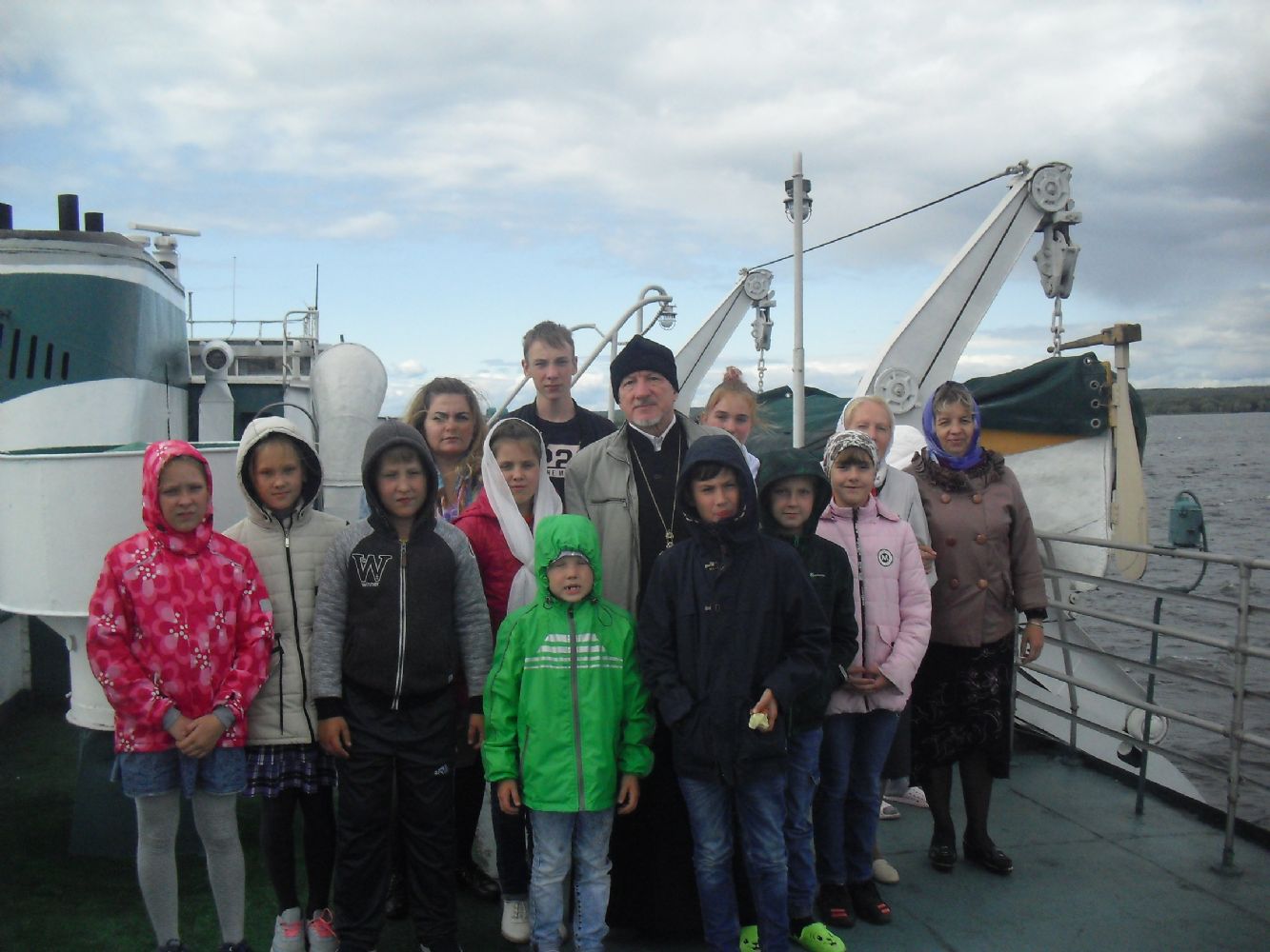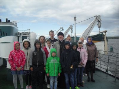 Подъезжаем к паромной переправе и с вещами переходим на паром. С парома наблюдаем маневры теплохода «Алдан», причаливающего к пристани г. Козьмодемьянска. На теплоходе нас заботливо встречают и быстро распределяют по каютам. И тут же дети становятся участниками культурной, развлекательной программы для детей, вкусный обед, отдых после первых трудов паломничества.