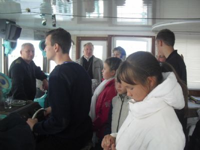 Теплоход «Алдан» со своей командой вновь радушно встречает нас. Мы уже торопимся вернуться в теплые, уютные каюты. Нас ждет горячий ужин. После ужина и вечерних молитв вместе с Батюшкой идем на встречу с капитаном теплохода в капитанскую рубку. Капитан рассказывает нам: о истории теплохода; о движении теплоходов, грузовых суден, толкачей и барж по реке Волге; отвечает на наши вопросы. Благодарим Капитана за полученную информацию и за его ответственный труд.