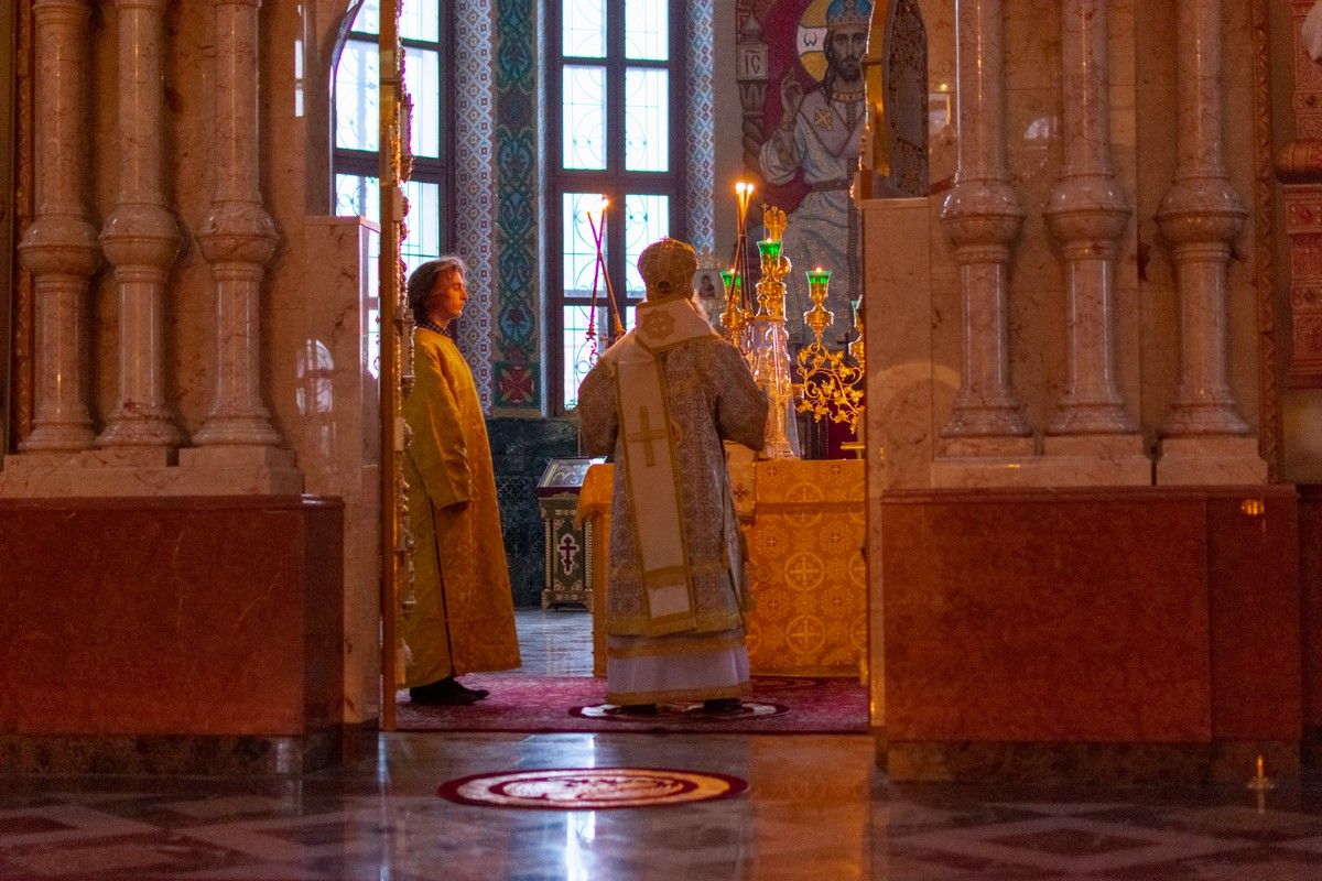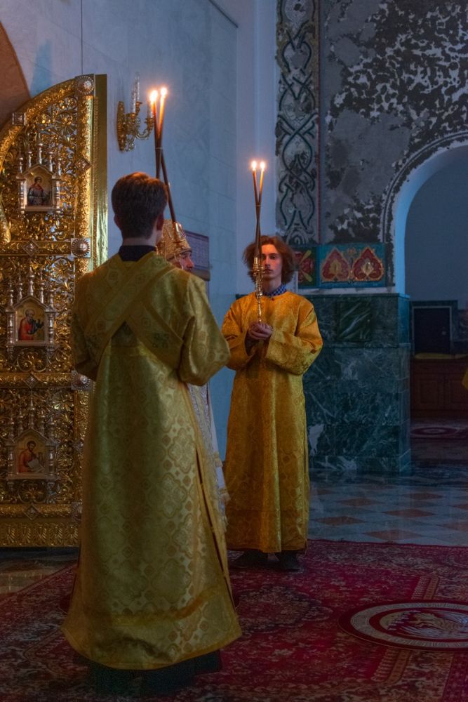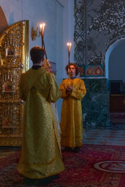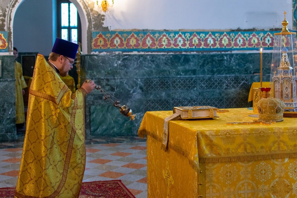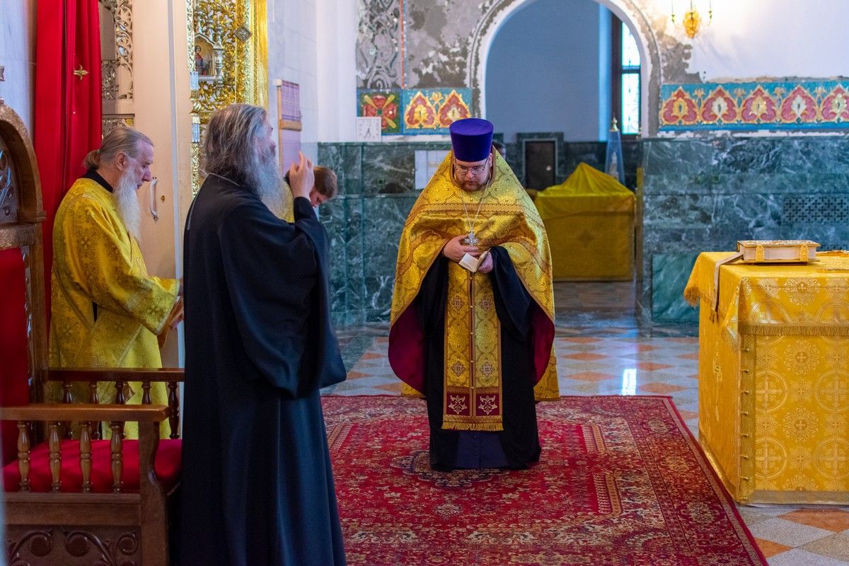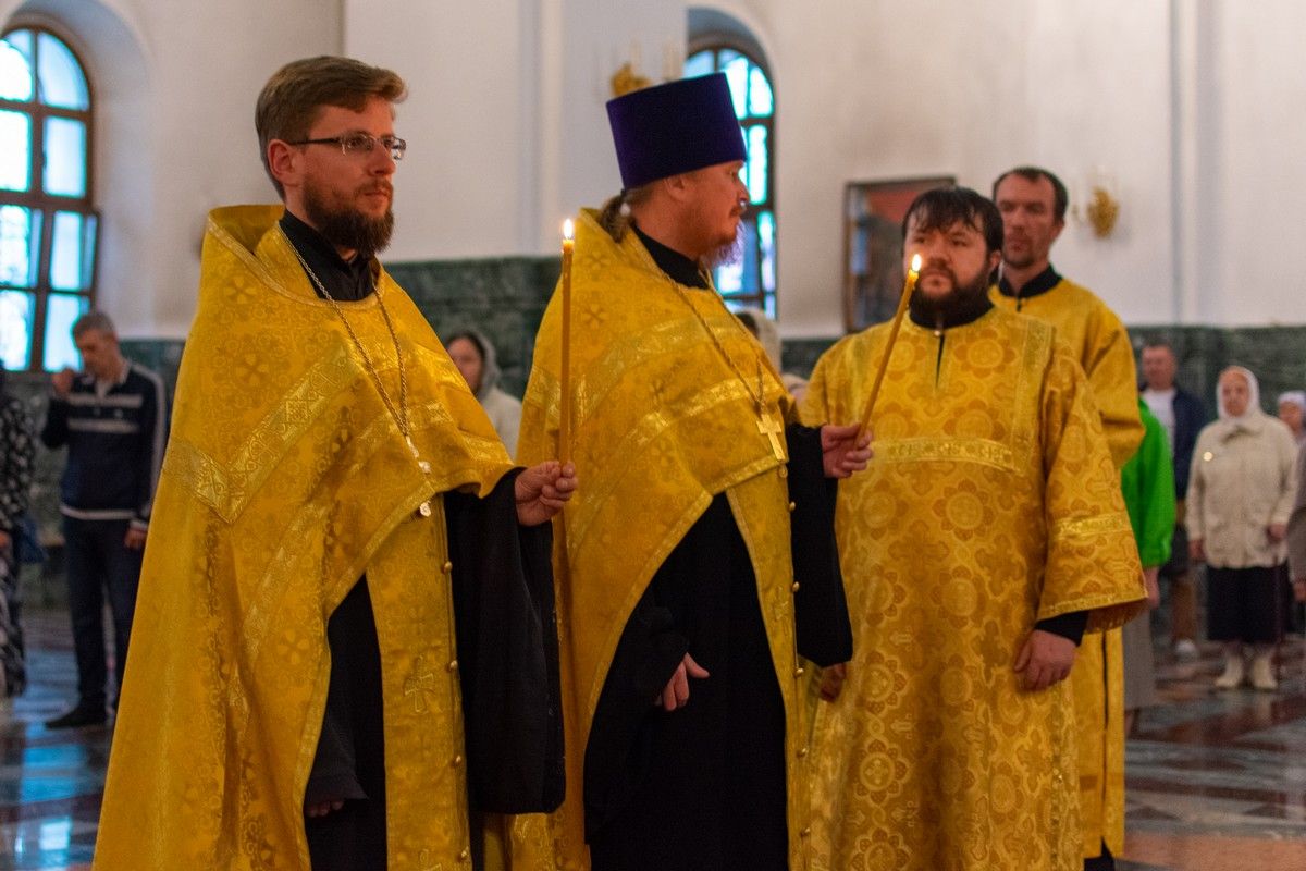 Владыке сослужили: ключарь собора протоиерей Сергий Поглазов, клирики собора иерей Артемий Промович, иерей Евгений Самойлов, диакон Андрей Дружинин и клирик храма Рождества Пресвятой Богородицы села Семеновка протодиакон Михаил Козловский.