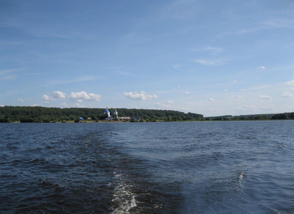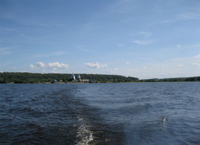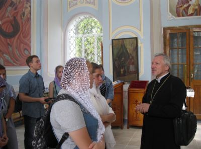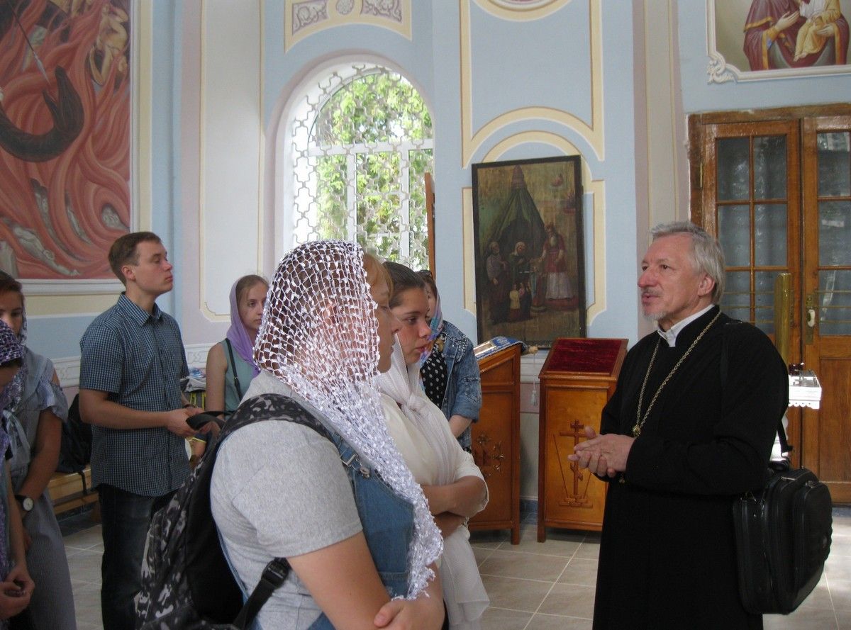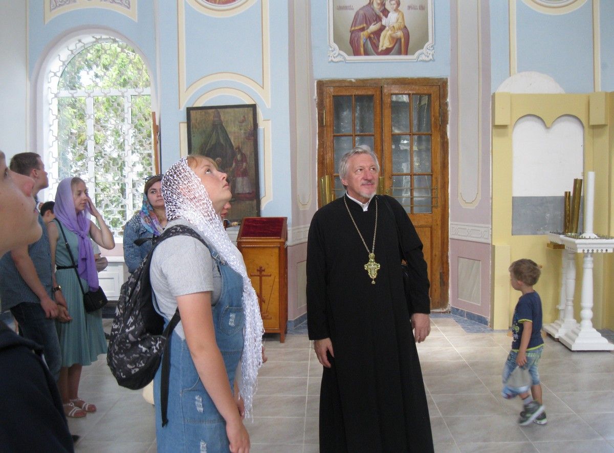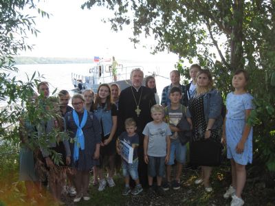 После молебна о путешествующих паломники переправились на катере на другой берег Волги, где стоит красивый бело-голубой храм, похожий на корабль. В церкви батюшка рассказал детям о ее устройстве, обратив их внимание на иконостас и настенную роспись, а также поделился своими воспоминаниями о детстве, проведенном в стенах этого храма. Затем все поспешили к настоятелю храма архимандриту Иоанну Барсукову получить благословение.