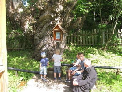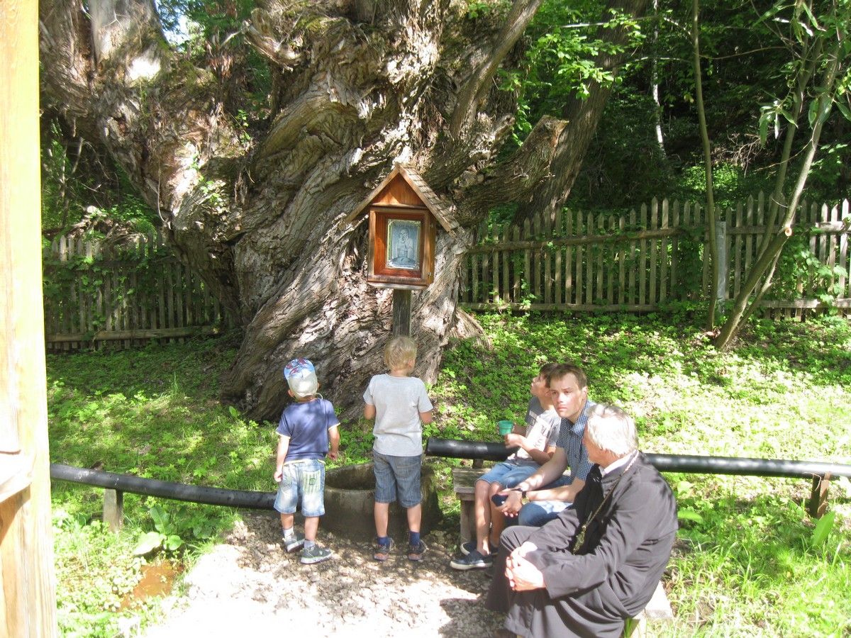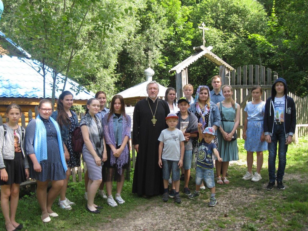 Далее наш путь лежал к источнику в честь Почаевской иконы Божией Матери. Здесь в часовне батюшка отслужил молебен. Дети пропели молитвы в честь Почаевской иконы Божией Матери, искупались в источнике, наполнили бутылочки святой водой.