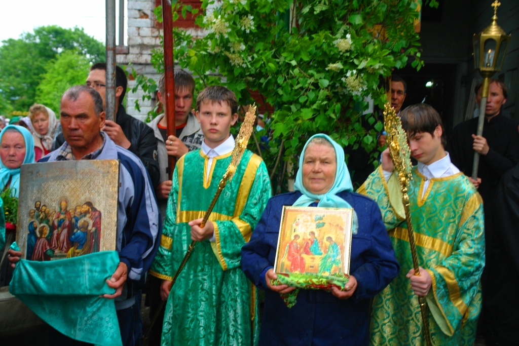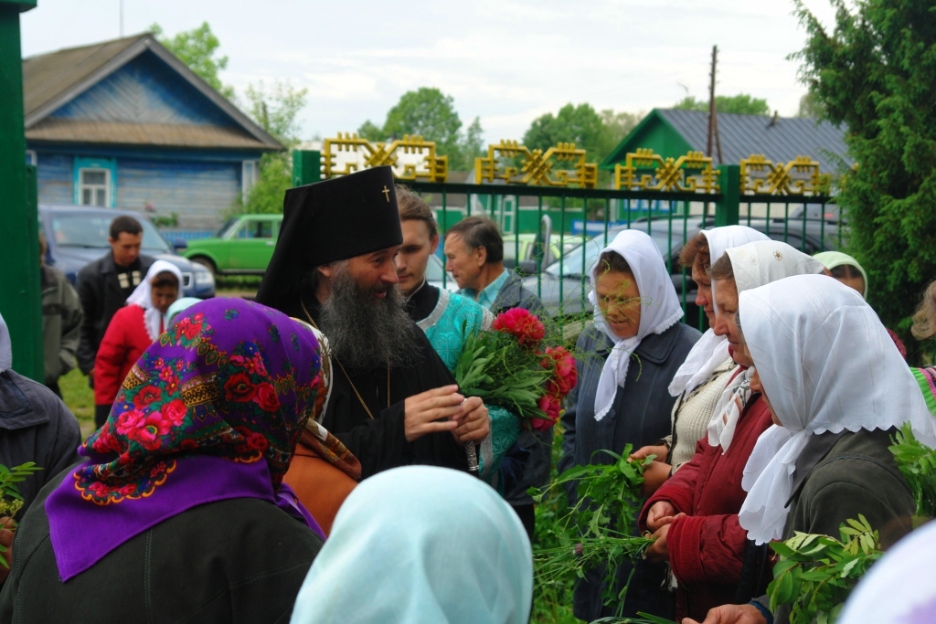 В этот день Владыка традиционно совершил Божественную литургию в Троицком храме села Емелево. После крестного хода верующие разделили между собой освященные ветви берез, находившиеся в храме со дня Святой Троицы.