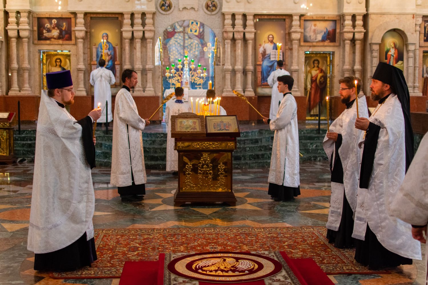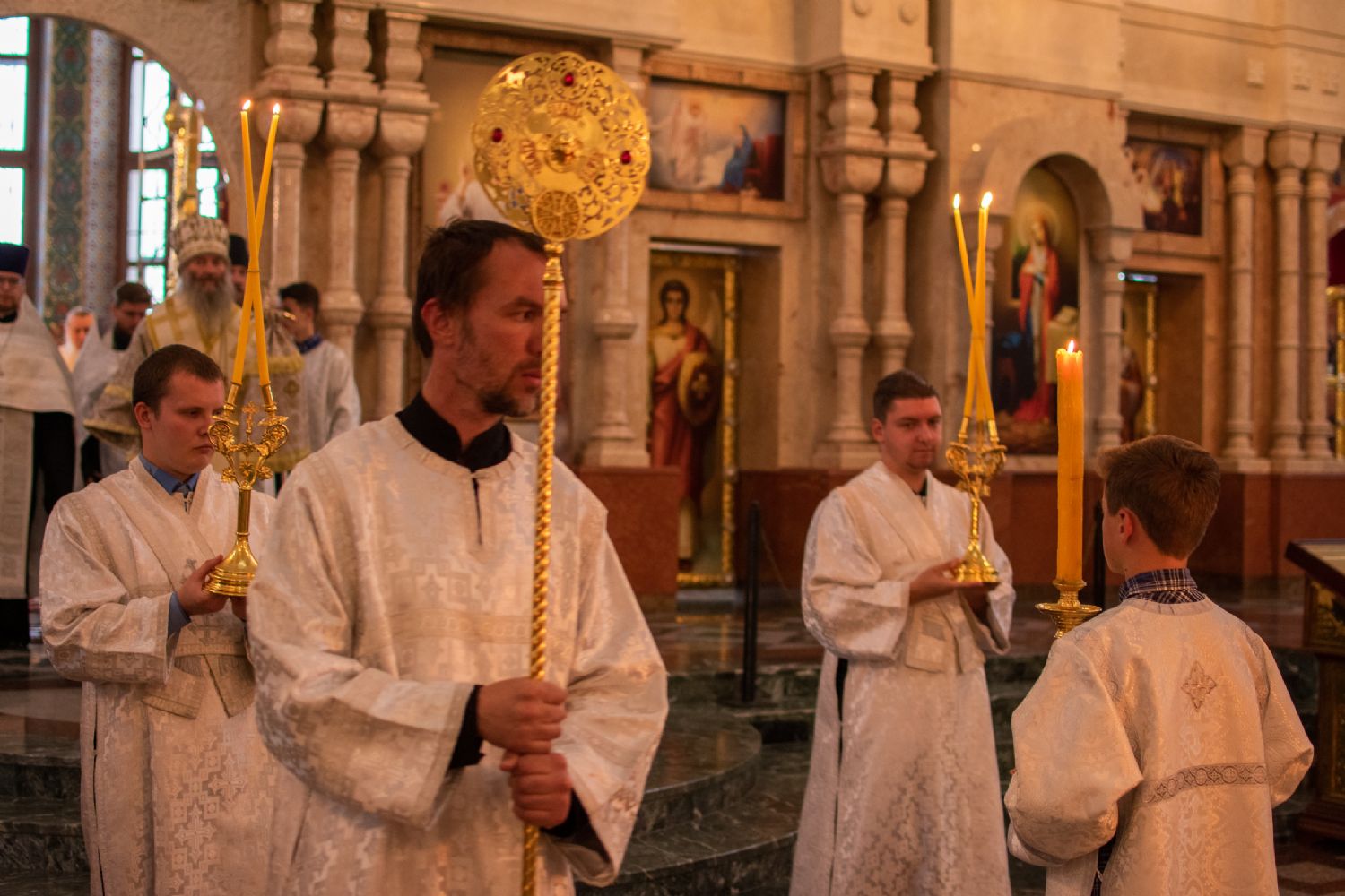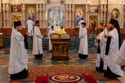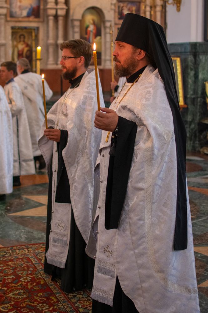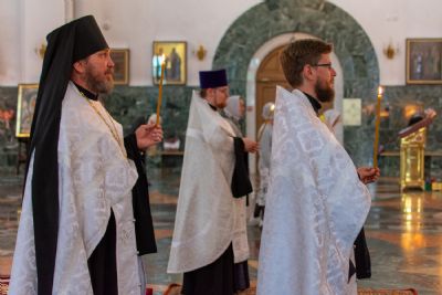 За Всенощным бдением Владыке сослужили: секретарь Йошкар-Олинского епархиального управления иеромонах Серафим (Пасанаев), клирики собора иереи Артемий Промович, Евгений Самойлов, диакон Андрей Дружинин и клирик храма Рождества Пресвятой Богородицы с. Семеновка протодиакон Михаил Козловский. Песнопения исполнял хор под руководством регента Надежды Поздеевой.