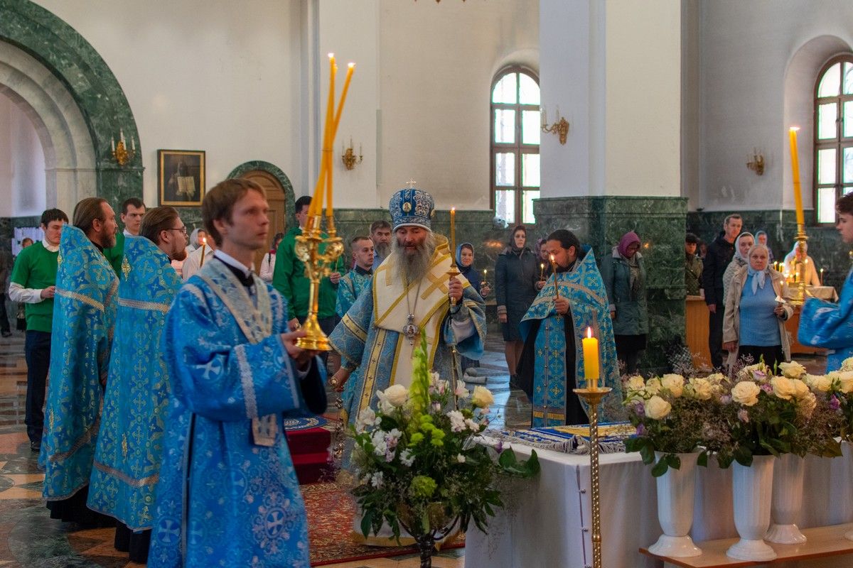 Владыке сослужили секретарь Йошкар-Олинского епархиального управления иеромонах Серафим (Пасанаев), клирики собора иереи Никифор Захаров, Артемий Промович, диакон Андрей Дружинин и клирик храма Рождества Пресвятой Богородицы с. Семеновка протодиакон Михаил Козловский. Песнопения исполнял детско-юношеский хор «Благовест» под руководством регента Надежды Поздеевой.