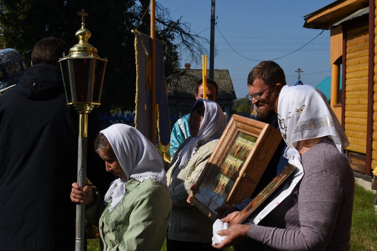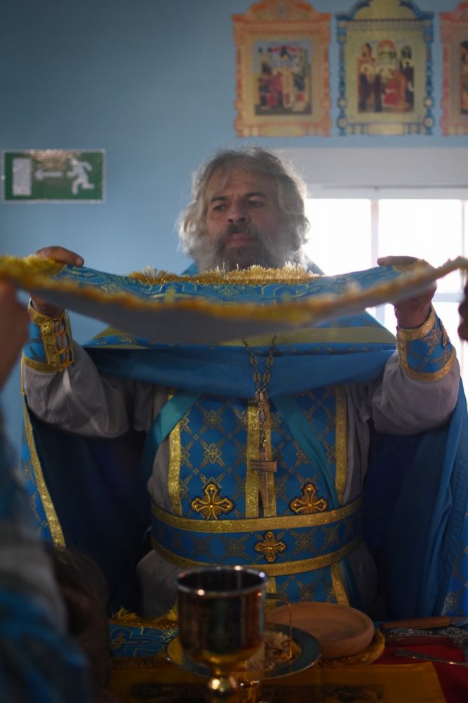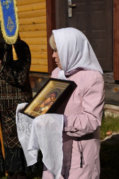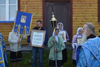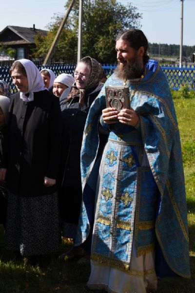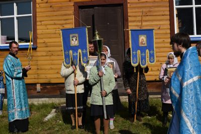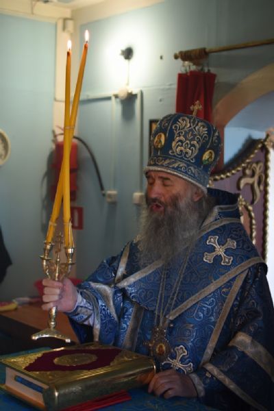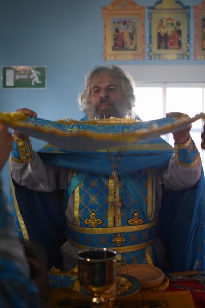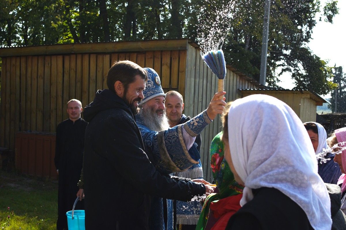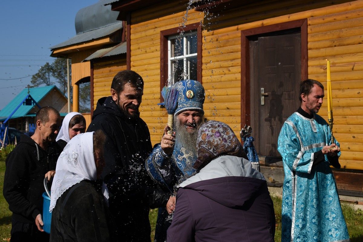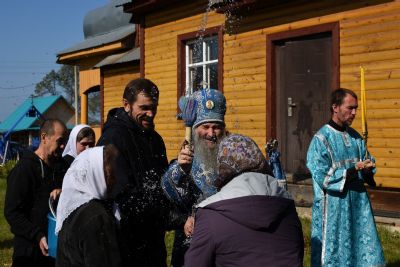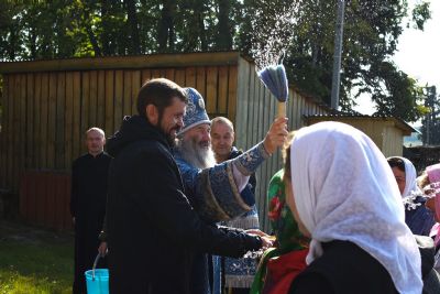 Богослужение началось торжественной встречей митрополита Иоанна и облачением в центре храма. После Литургии прошел крестный ход вокруг храма с кроплением святой водой и чтением Евангелия.