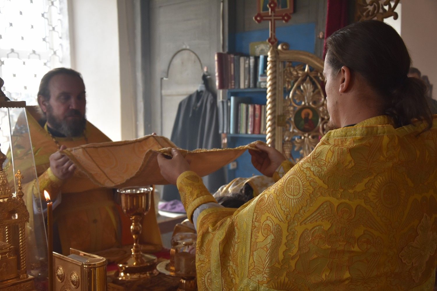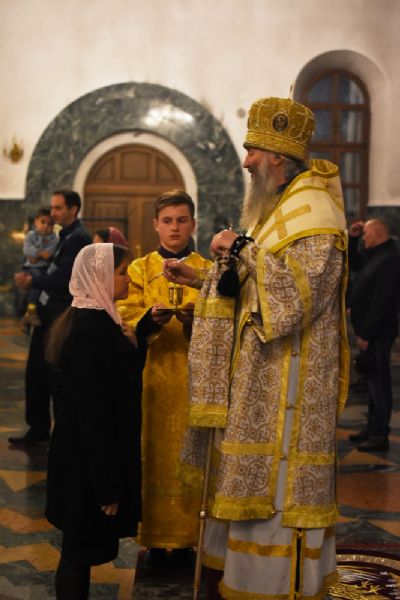 Владыке сослужили: ключарь собора протоиерей Сергий Поглазов, клирики собора иереи Евгений Самойлов, Артемий Промович, Никифор Захаров, диакон Игорь Коваль и клирик храма Рождества Пресвятой Богородицы села Семеновка протодиакон Михаил Козловский.