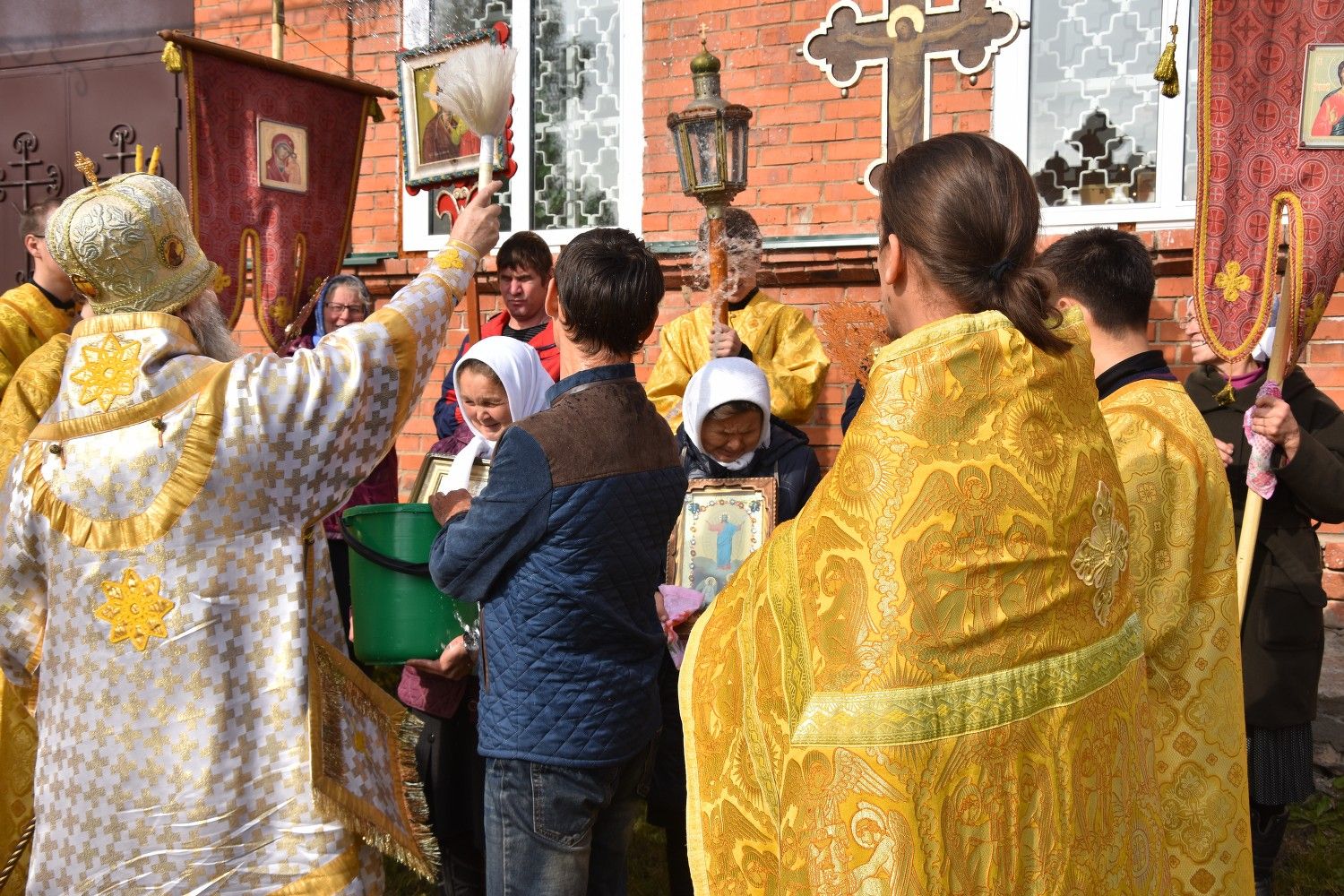 После литургии прошел крестный ход вокруг храма с чтением Евангелия и кроплением святой водой. Была совершена заупокойная лития за алтарем у места погребения предыдущего настоятеля храма протоиерея Геннадия Ромашева.