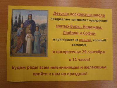 В минувшую неделю в храме Рождества Христова города Йошкар-Олы появилось объявление с приглашением всех прихожан, а особенно именинниц на праздничный концерт воскресной школы, посвященный памяти святых мучениц Веры, Надежды, Любови и Софии.