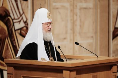 Затем Святейший Патриарх Кирилл обратился к участникам II Международного съезда регентов и певчих с Первосвятительским словом.