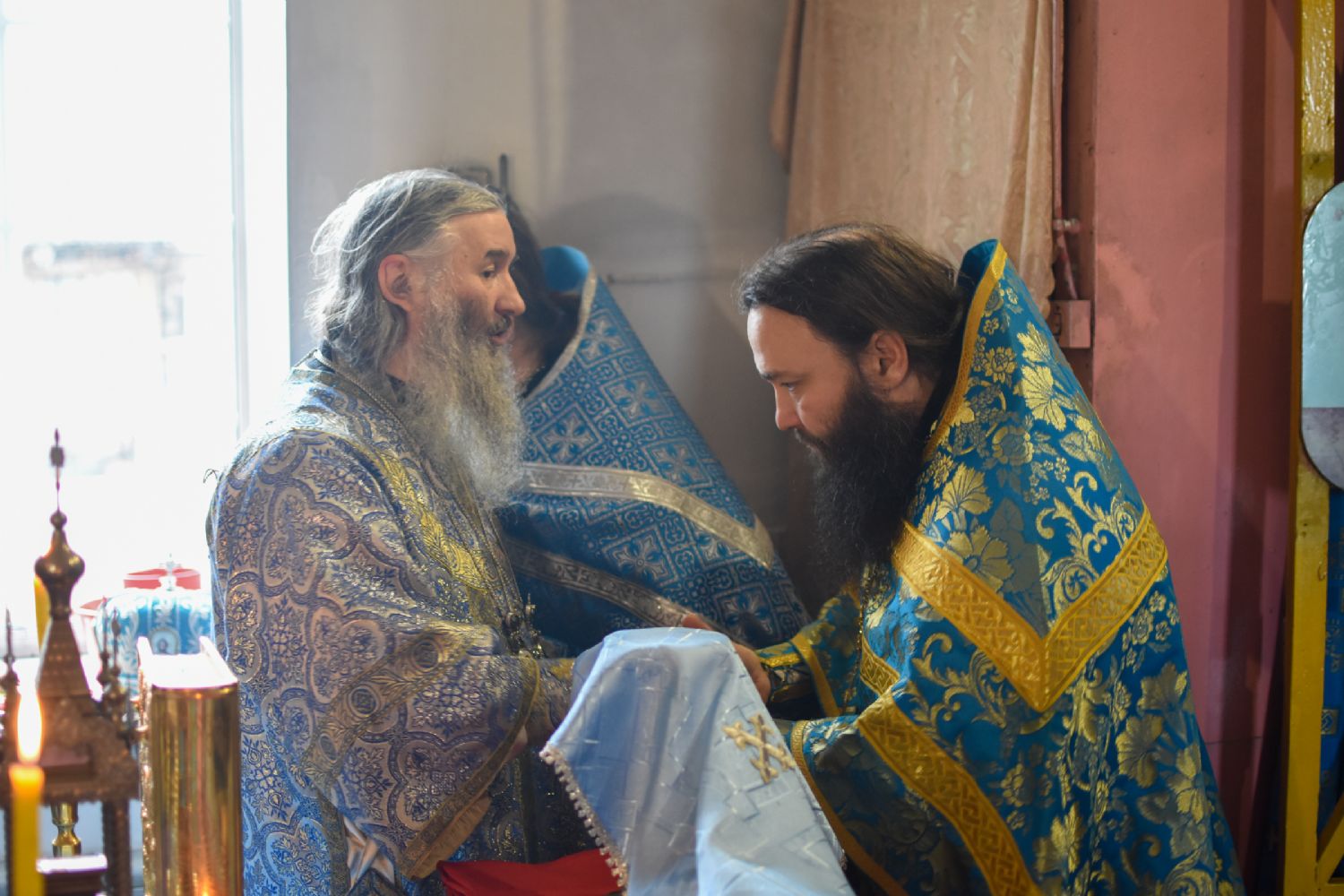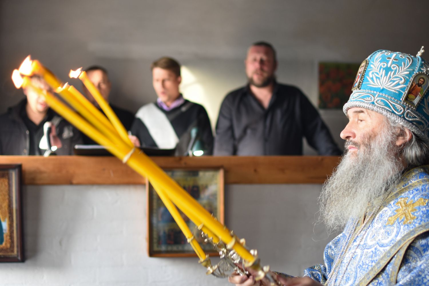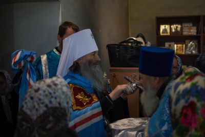 Перед Литургией после чтения часов священство и прихожане торжественно встретили Владыку в притворе храма, поднесли каравай и цветы. Митрополит Иоанн при чтении особых молитв диаконом и при пении хора облачился в центре храма.