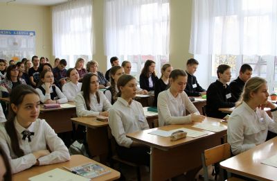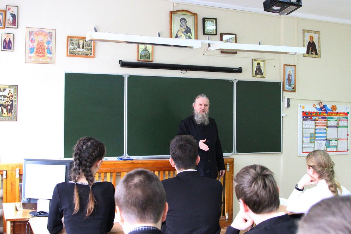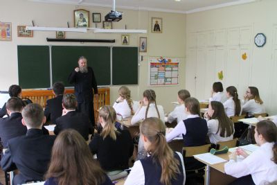 Не менее интересной была и беседа о национальной идее России. Долгое время в официальных кругах предпринимались попытки разработать ее, дав точный ответ на вопрос: «В чём призвание российского народа?». Очень четко ответил на него известный русский религиозный мыслитель Владимир Сергеевич Соловьев: «Идея нации есть не то, что она думает о себе во времени, но то, что Бог думает о нас в вечности». Используя в качестве основы это высказывание философа, отец Сергий подвел учащихся к выводу, что в основе любого события лежит Божий Промысел.