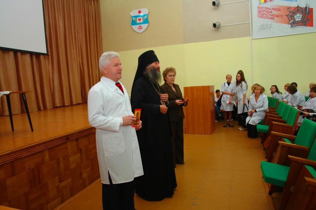 Архиепископ Иоанн вручил собравшимся в зале первокурсникам медколледжа иконки Божией Матери, привезенные со Святой Горы Афон, и благословил их на будущие труды и жертвенное служение людям.