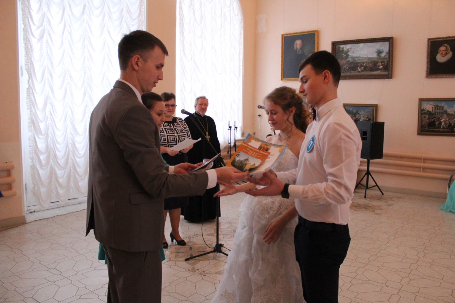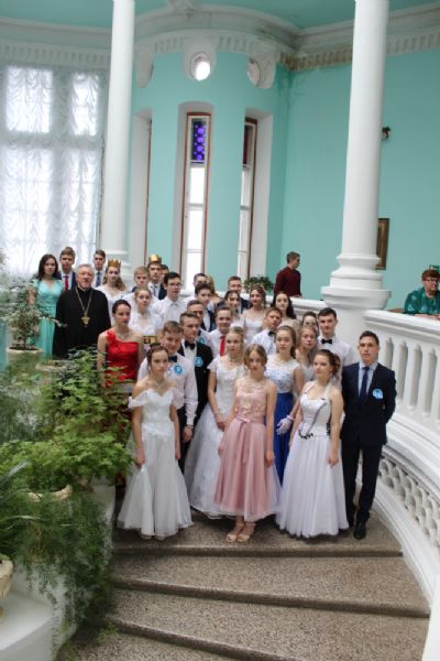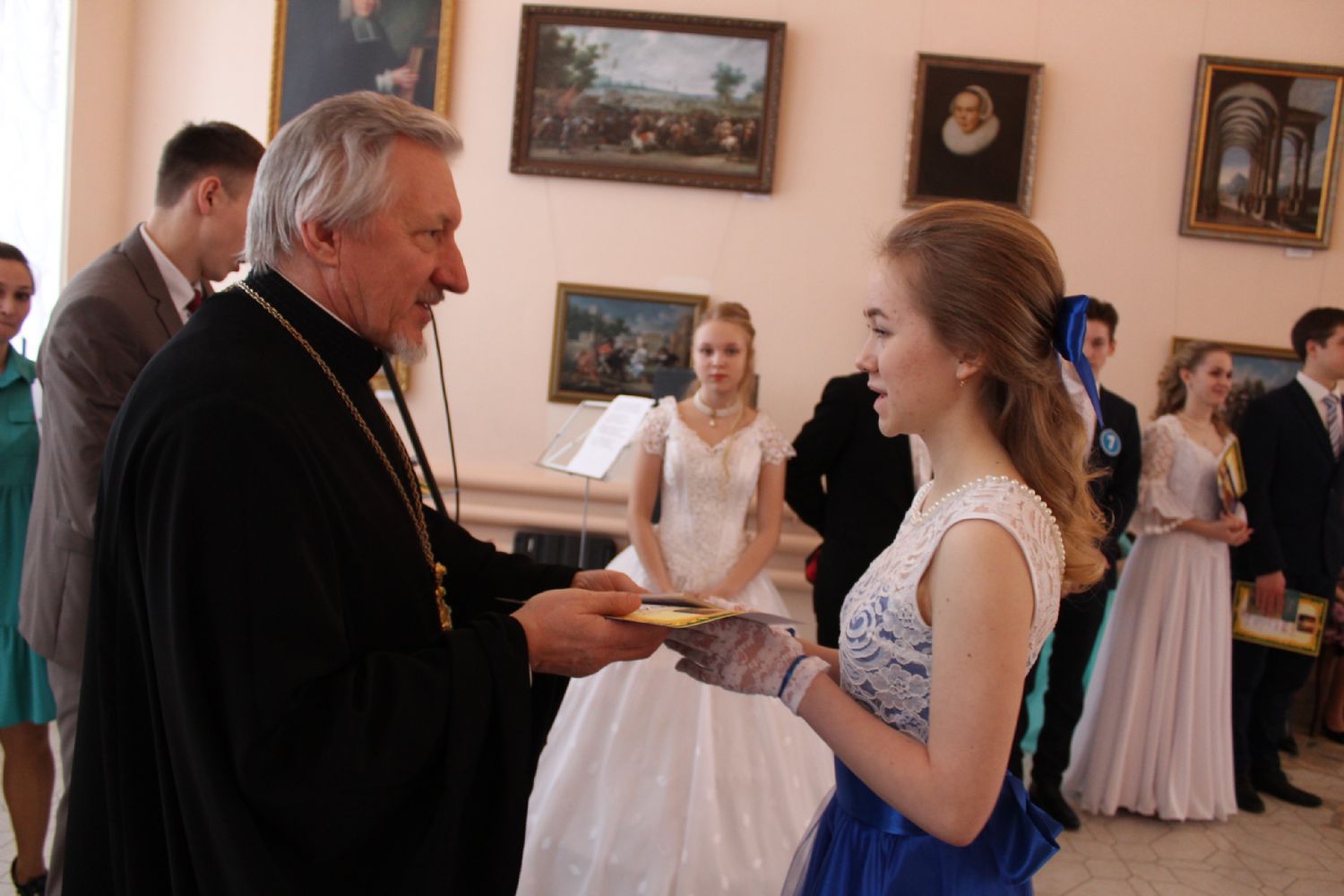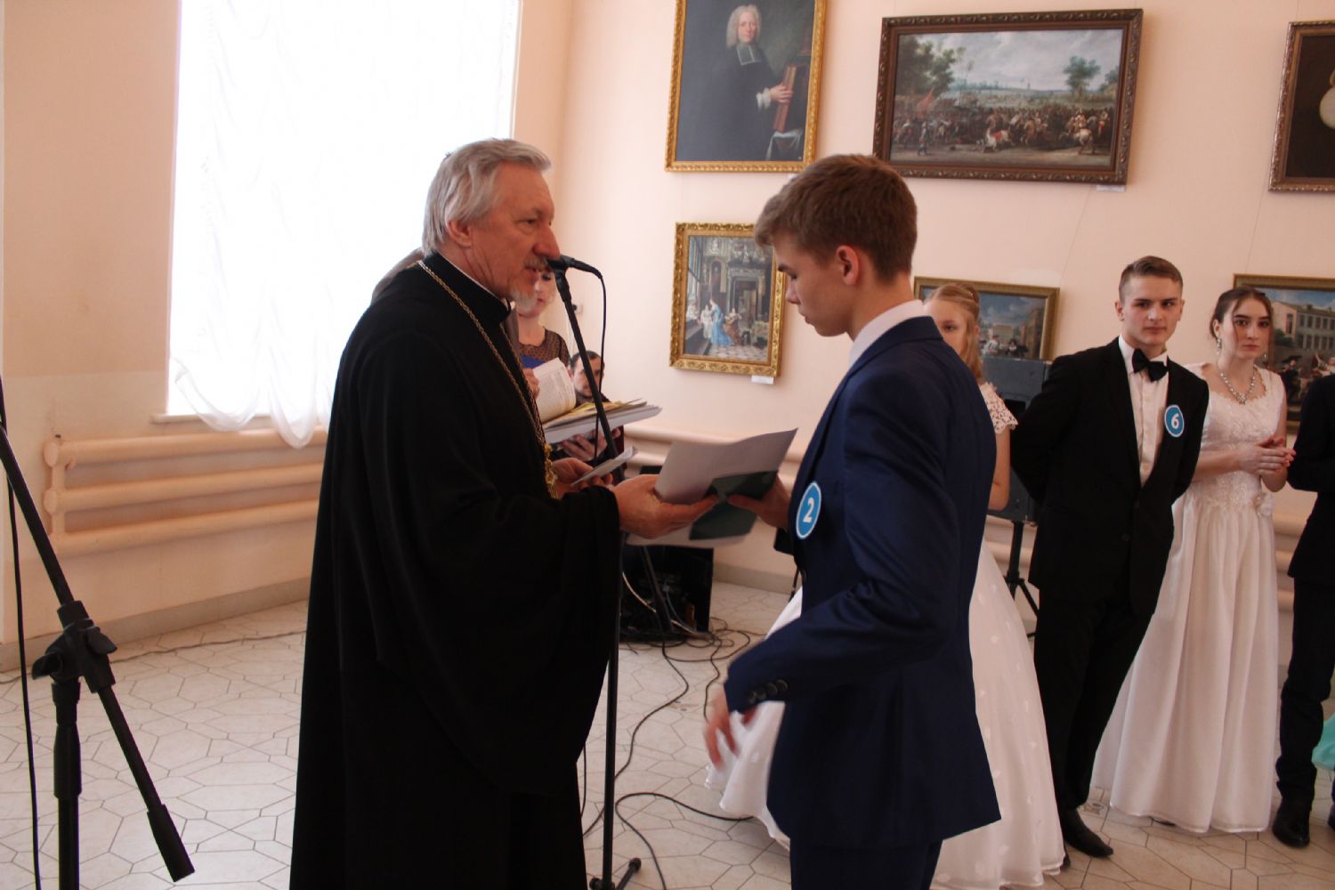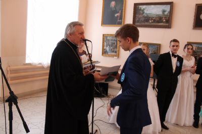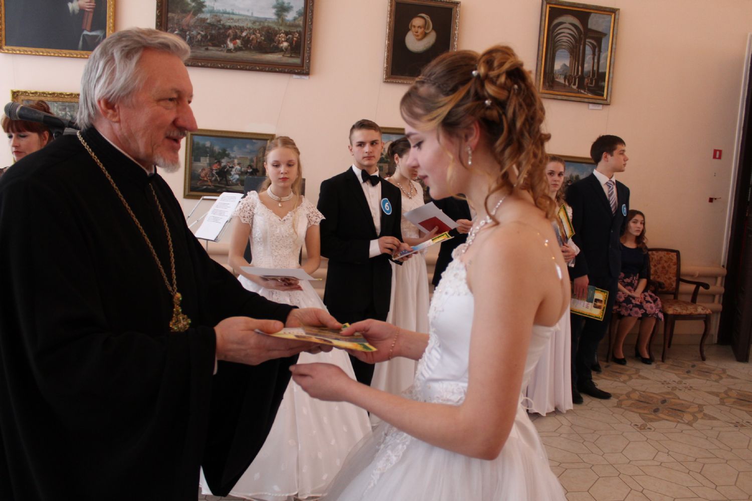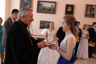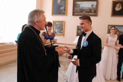 Бал заканчивается награждением - батюшка Николай вручает каждому участнику диплом и книгу в подарок.