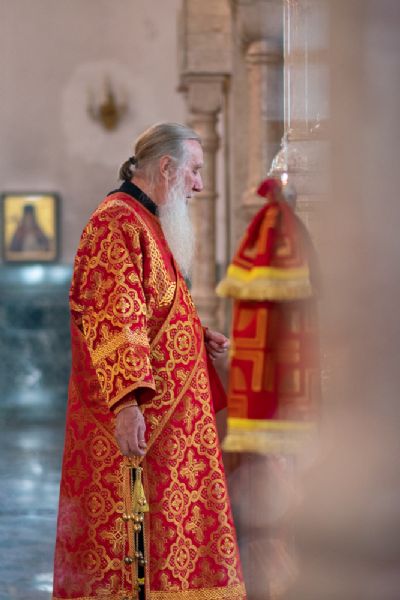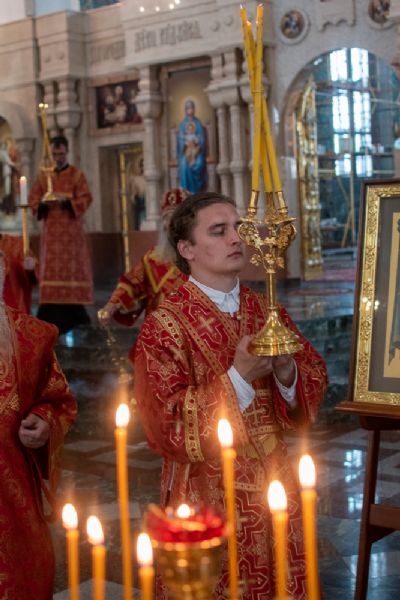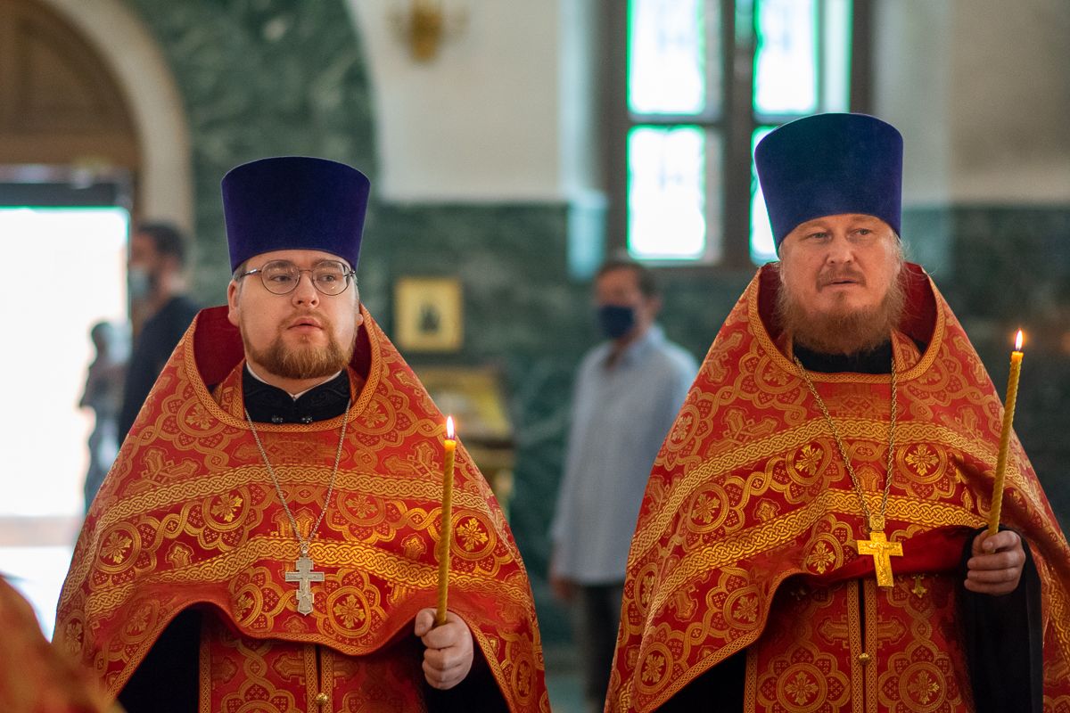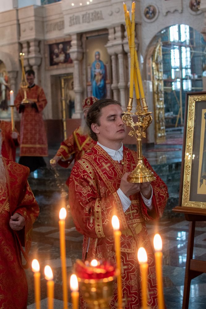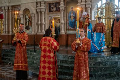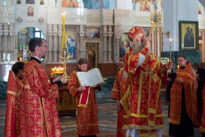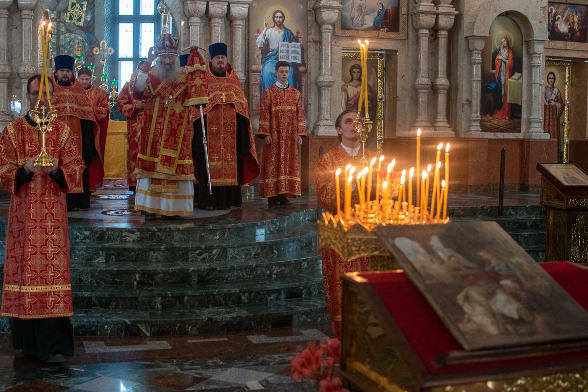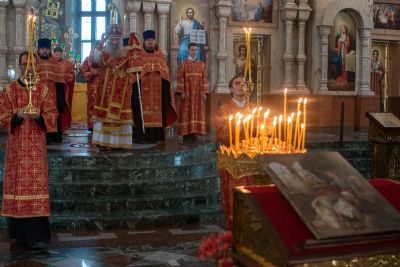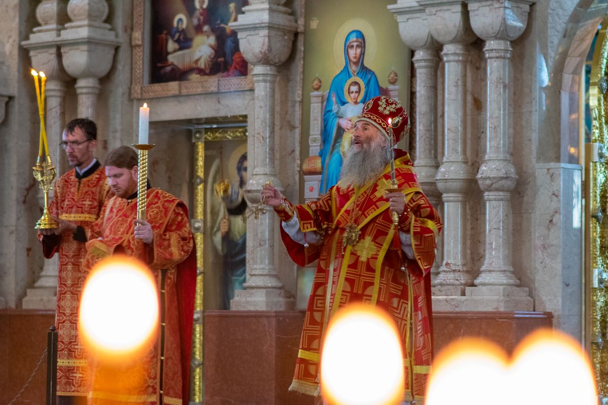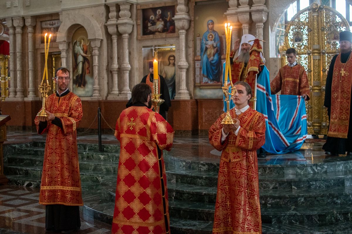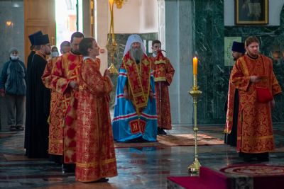 Владыке сослужили ключарь собора протоиерей Сергий Поглазов, клирики собора иереи Никифор Захаров, Артемий Промович, диаконы Андрей Дружинин, Игорь Коваль и клирик храма Рождества Пресвятой Богородицы протодиакон Михаил Козловский. Песнопения исполнял хор под руководством регента Татьяны Черновой.