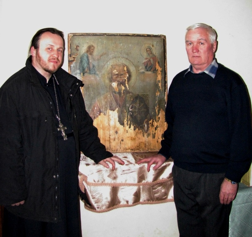 Это обезглавленные иконы Спасителя с остатками сусального золота, предположительно икона Трех святителей и архангела Михаила. На лишенной изображения доске из кипарисового дерева икону апостола Андрея Первозданного удалось опознать только по надписи, сохранившейся на обратной стороне. Судя по надписи, ранее она принадлежала ныне не существующему скиту Андрея Первозванного на Святой горе Афон. И, наконец, образ святителя Николая Чудотворца вятского письма XIX века – со следами грубых ударов топором, потускневшей и облезлой краской.