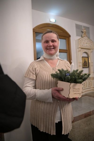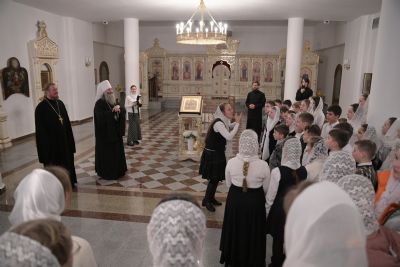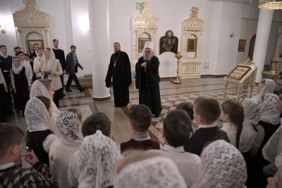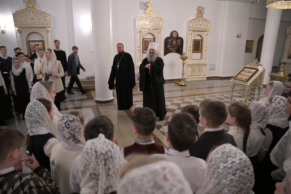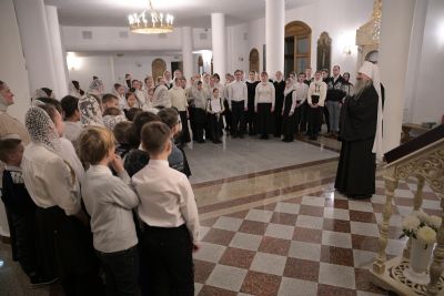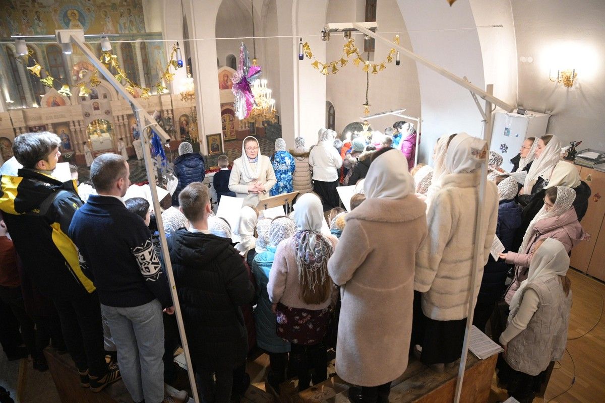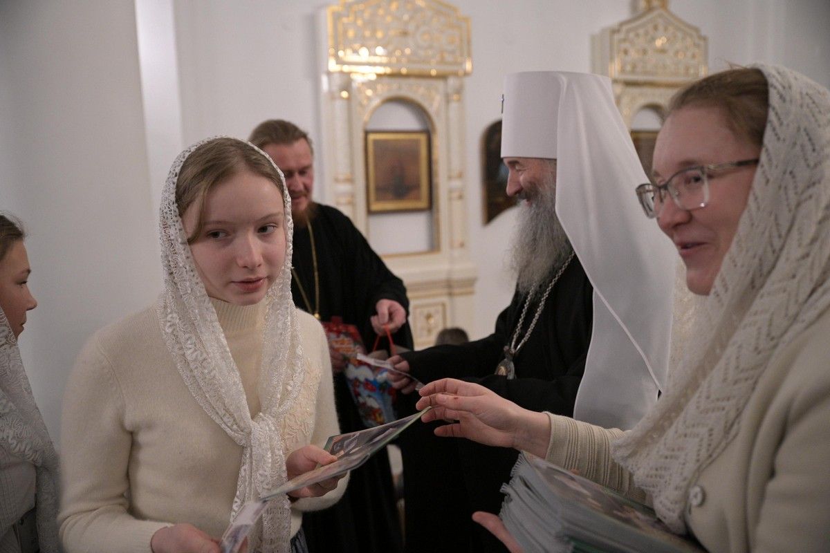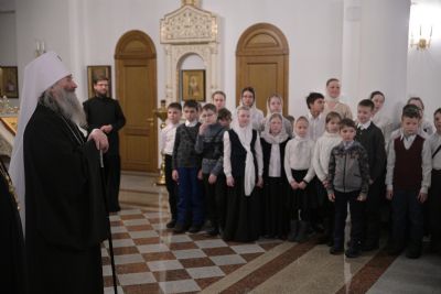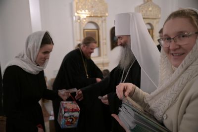 После богослужения Владыка в нижнем приделе кафедрального собора поздравил певчих хора «Благовест» со светлым праздником Рождества Христова и вручил сладкие подарки.