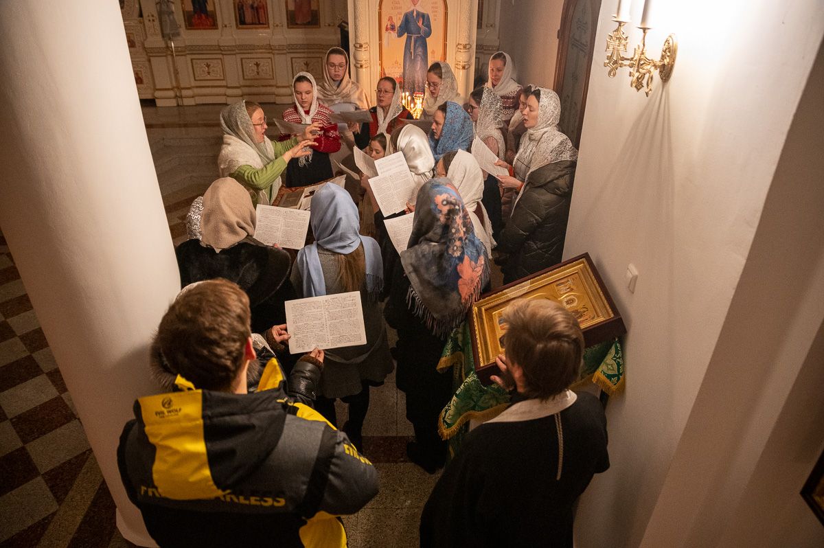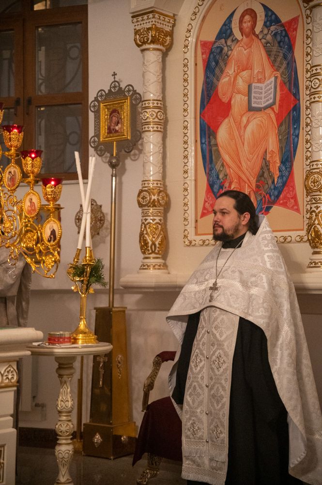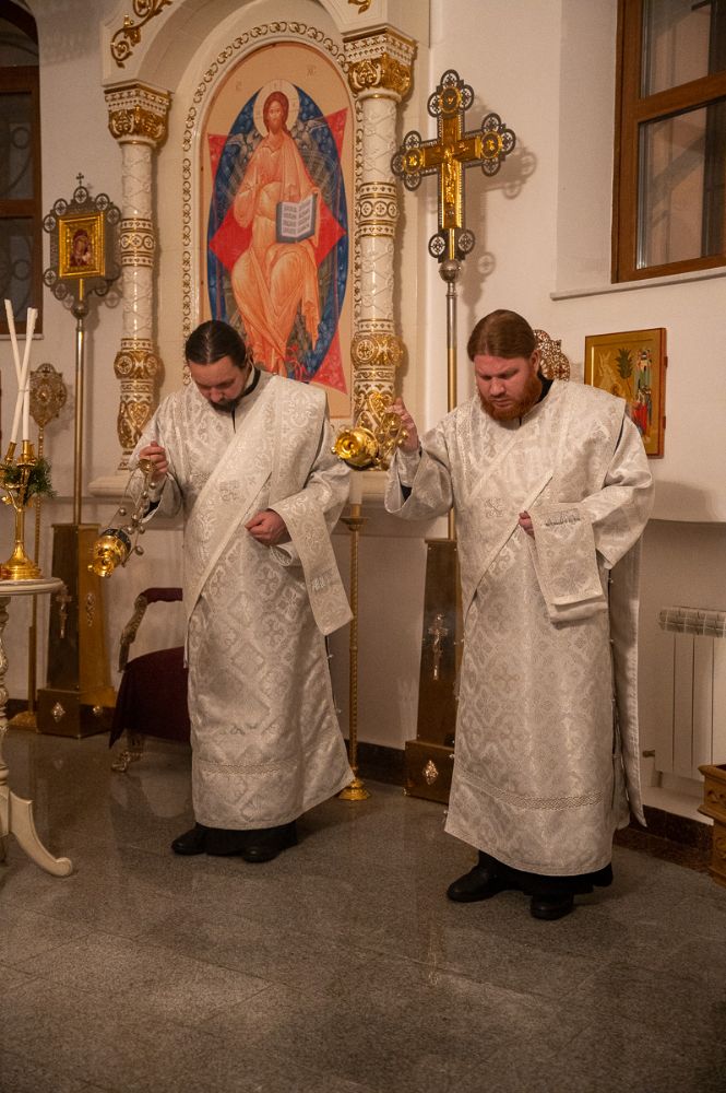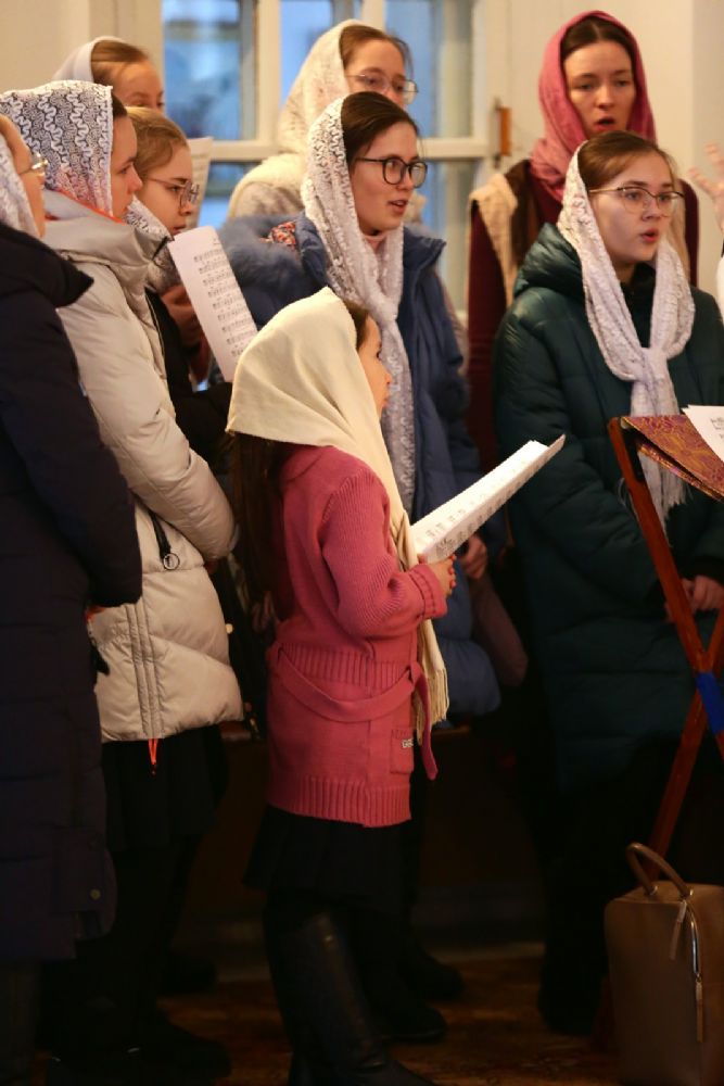 Вечером Его Высокопреосвященству сослужили секретарь Йошкар-Олинского епархиального управления иеромонах Серафим (Пасанаев), ключарь собора протоиерей Сергий Поглазов, клирики собора иерей Никифор Захаров, Евгений Самойлов, Александр Староверов, диаконы Андрей Дружинин, Игорь Коваль, клирик храма Рождества Пресвятой Богородицы с. Семеновка протодиакон Михаил Козловский. Песнопения исполнял детско-юношеский хор «Благовест» под управлением регента Татьяны Черновой.
