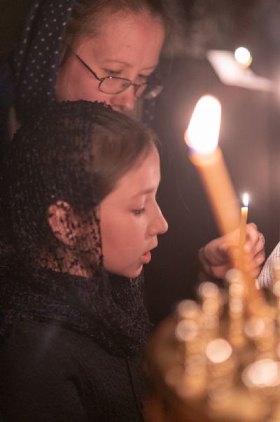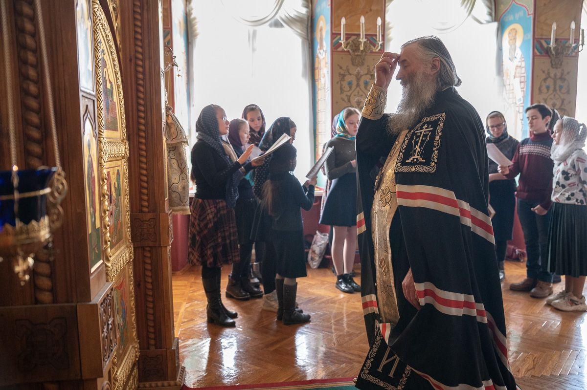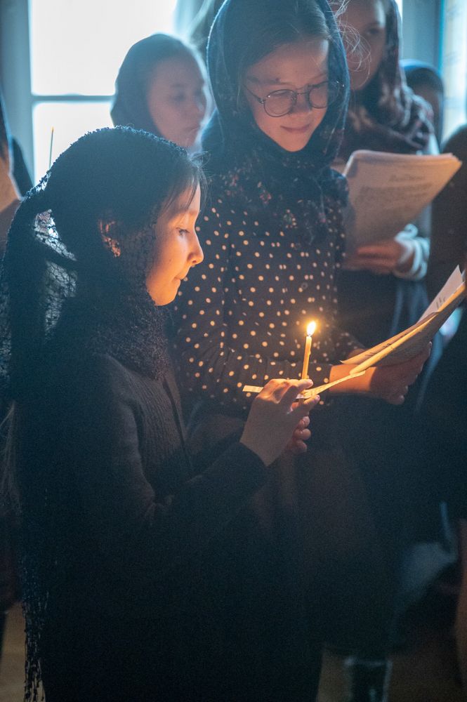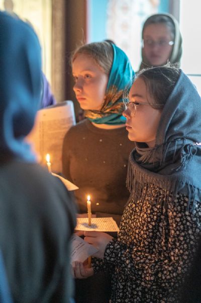 Все чтения и песнопения великого повечерия и утрени исполняли певчие детско-юношеского хора. Специально для лучшего освоения ими порядка и особенностей богослужения Владыка традиционно проводит в домовом храме такие богослужебные практики, которые приносят певчим большую пользу.