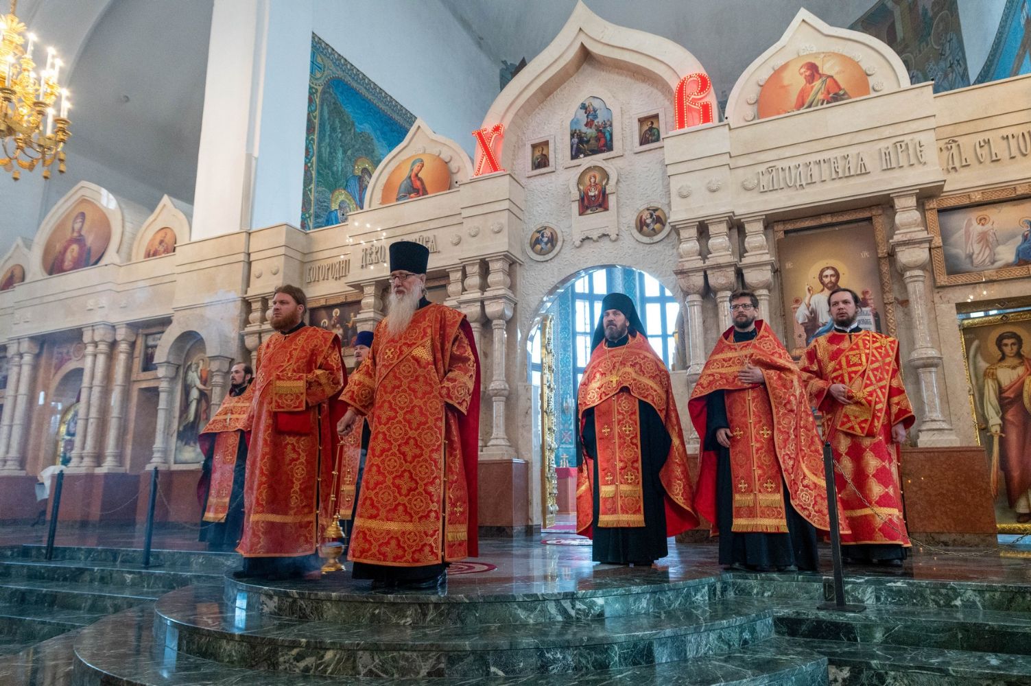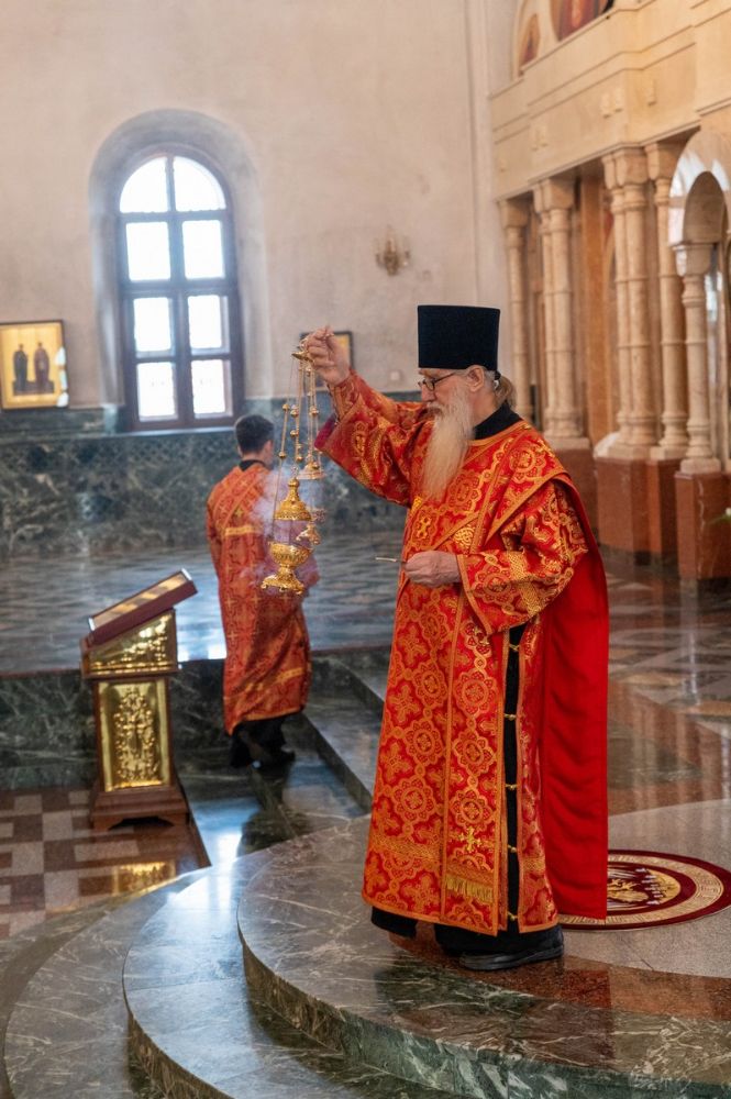 На вечерне Владыке сослужили секретарь Йошкар-Олинского епархиального управления иеромонах Серафим (Пасанаев), ключарь кафедрального собора протоиерей Сергий Поглазов, настоятель Воскресенского собора иерей Алексий кирюшкин, протодиакон Михаил Козловский и клирики Благовещенского собора. Песнопения исполнял детско-юношеский хор «Благовест» под управлением Татьяны Черновой.