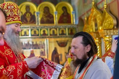 На малом входе митрополит Иоанн вручил богослужебно-иерархические награды клирик Вознесенского собора иерей Владимир Глебов удостоен права ношения палицы; клирик храма Рождества Христова с. Семеновка Димитрий Иванов награжден наперсным крестом; клирики Вознесенского собора иерей Димитрий Копылов – камилавкой; иерей Игорь Лебедев – набедренником.