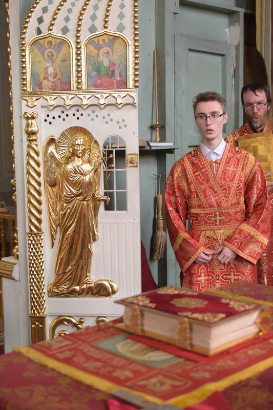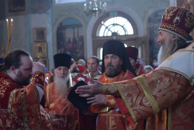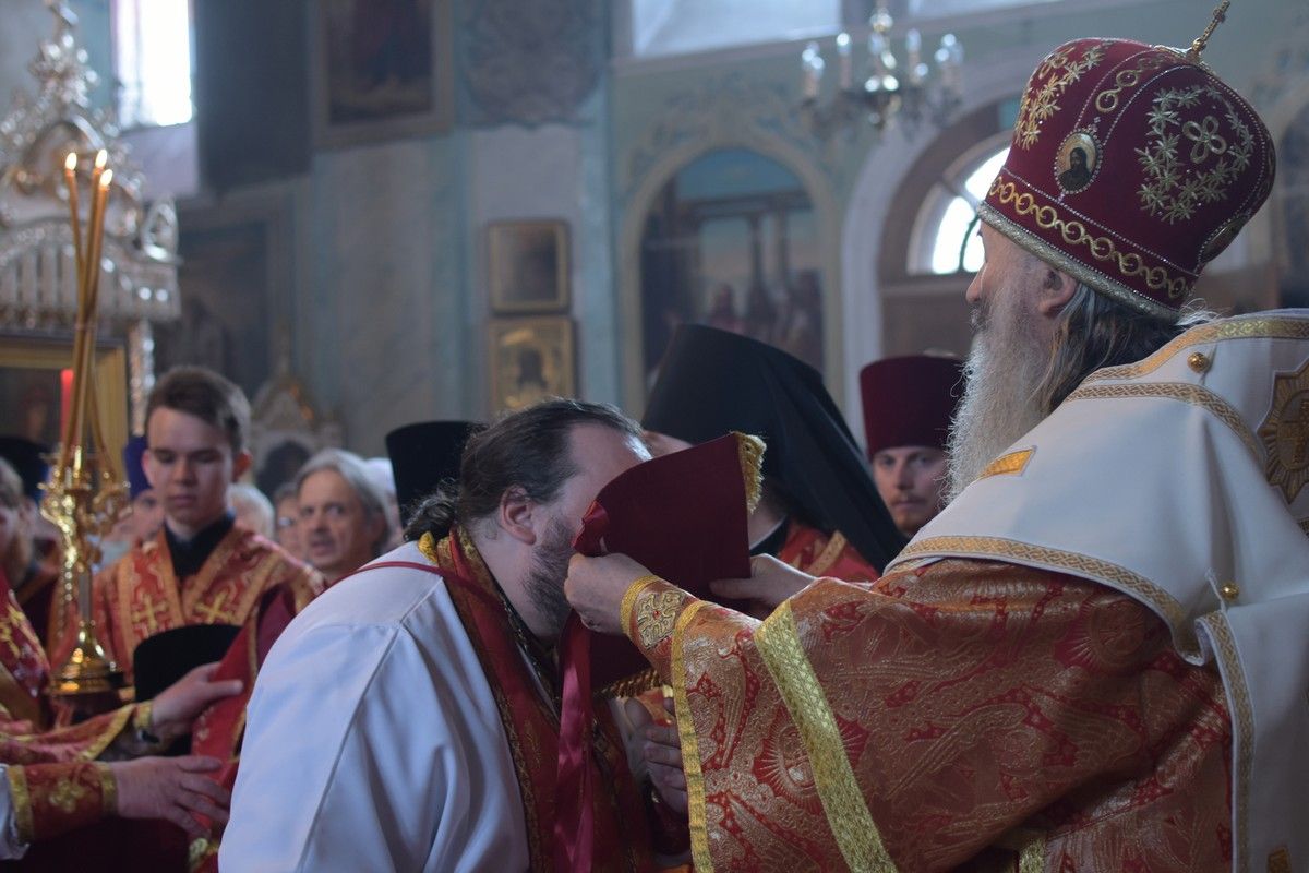 На входе с Евангелием митрополит Иоанн вручил богослужебно-иерархические награды клирикам Горномарийского благочиния: права служения Литургии с открытыми Царскими вратами до «Иже херувимы» удостоен протоиерей Николай Барсуков, права ношения палицы – протоиерей Алексий Сущев и протоиерей Николай Соколов, права ношения наперсного креста – иерей Алексий Семенов.